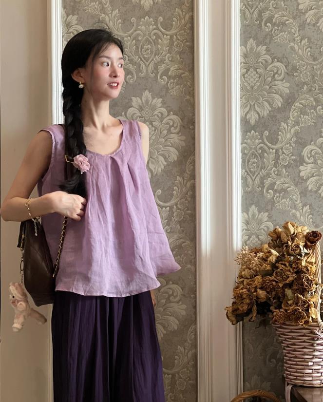 一套紫色系的搭配,真的很省心,也不容易出錯,溫柔的淺紫色無袖衫,喜歡它寬鬆的版型,可舒適自在了,也完全不挑身材。搭配起一條深紫色闊腿褲,鬆弛感十足的穿搭,隨性自在又慵懶。