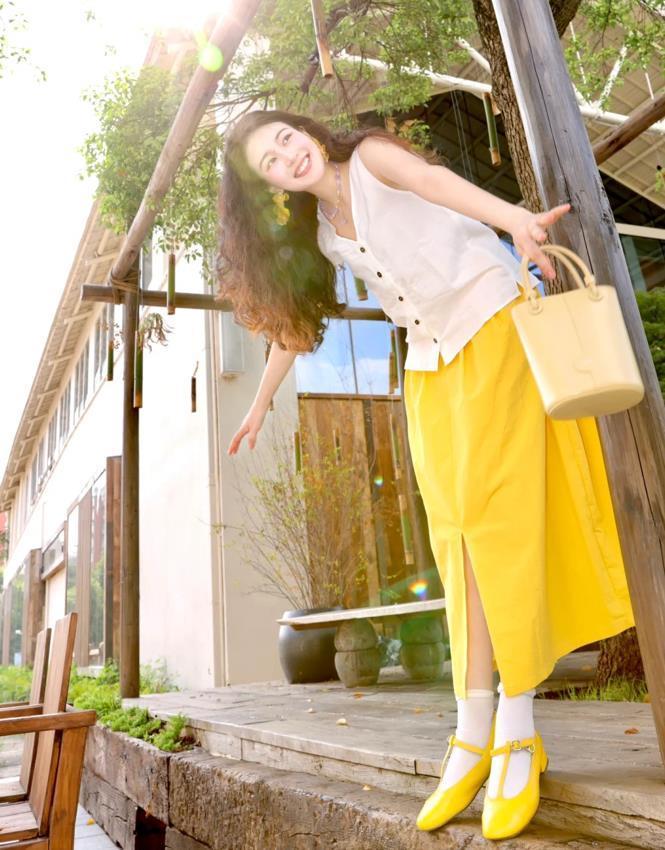 那麼明亮的顏色,最適合夏天了,很治癒的色系,如果你擔心自己膚色駕馭不了,可以選擇相關的下裝,或者是鞋子、包包等。檸檬黃半身長裙,搭配白色無袖衫,這樣的配色,就是很吸睛洋氣,滿滿的活力氣息。