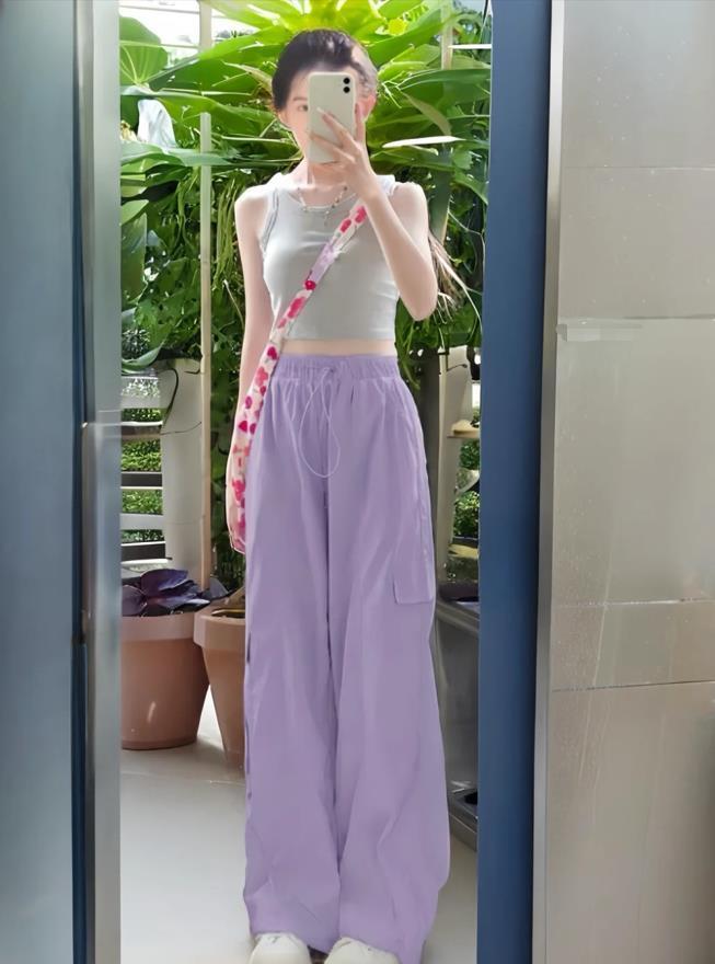 夏天就是需要溫柔的紫色,像這種淡淡色調的紫,一點都不挑膚色的,工裝闊腿褲,穿起來巨不挑身材,也巨顯瘦的,褲子的面料薄透又舒適,夏天穿也不會覺得悶熱,很遮肉顯瘦。