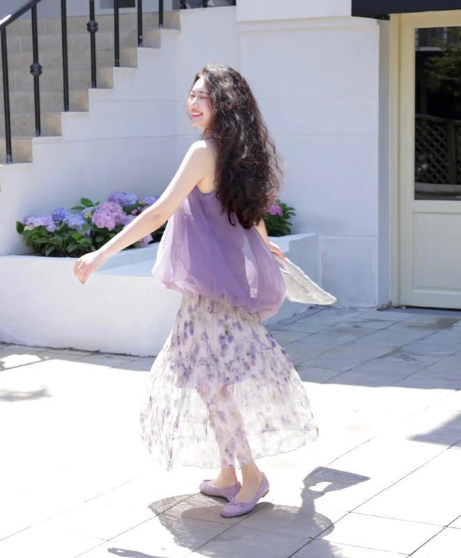 少女範十足的穿搭,溫柔紫色無袖衫+碎花半身長裙,自帶清爽涼快又充滿仙氣的搭配,最重要的是衣服面料很柔軟透氣,完全不用擔心會顯悶熱,腳下踩着的紫色單鞋,與上衣顏色進行了呼應,增加了造型和諧度又時髦。