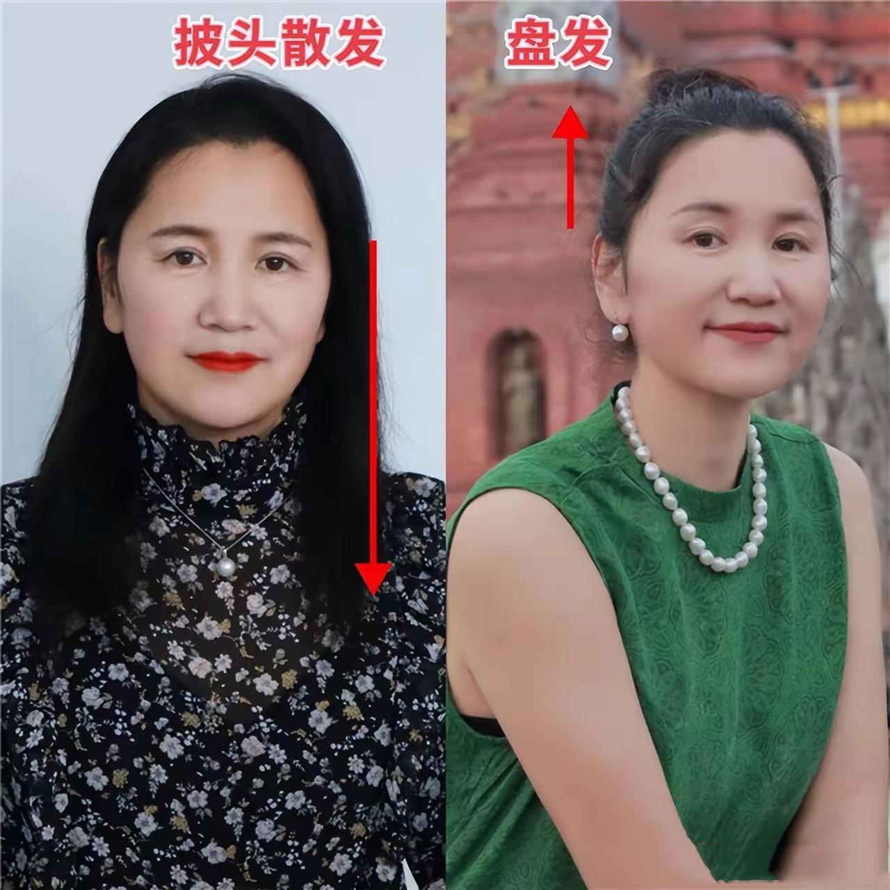 適當的選擇盤發造型,則會讓自己的美麗翻倍。優雅的盤發,視覺中心在無形中得到了抬高。臉部線條、肌膚緊緻程度也明顯提升,更顯年輕了。