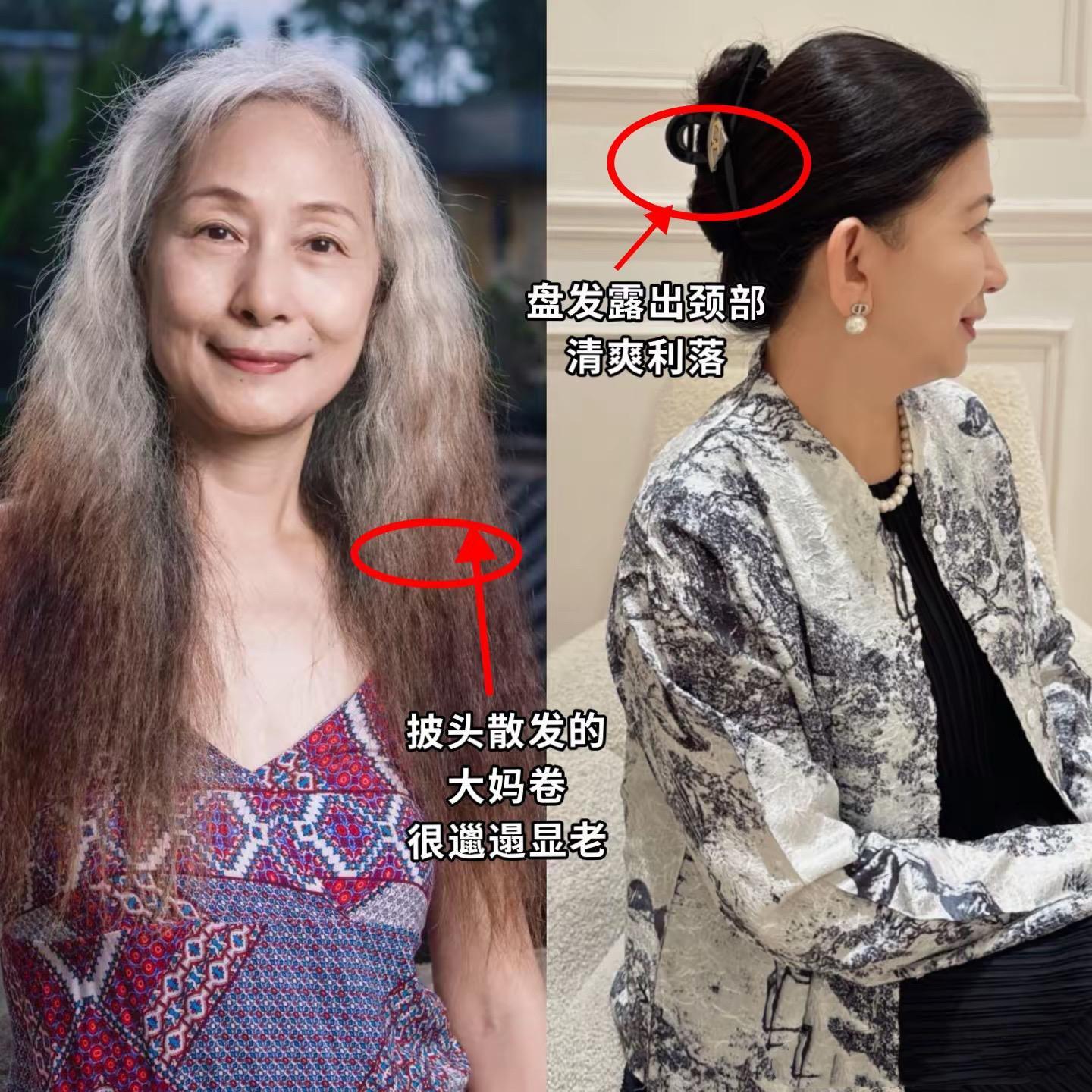 其實披頭散髮的大媽卷,真的很顯老、也很邋遢。年紀大了以後髮質本就不好,加上後期打理不當,頭髮像爛草一下,顯得很老氣,倒不如直接將長髮挽起更優雅清爽。