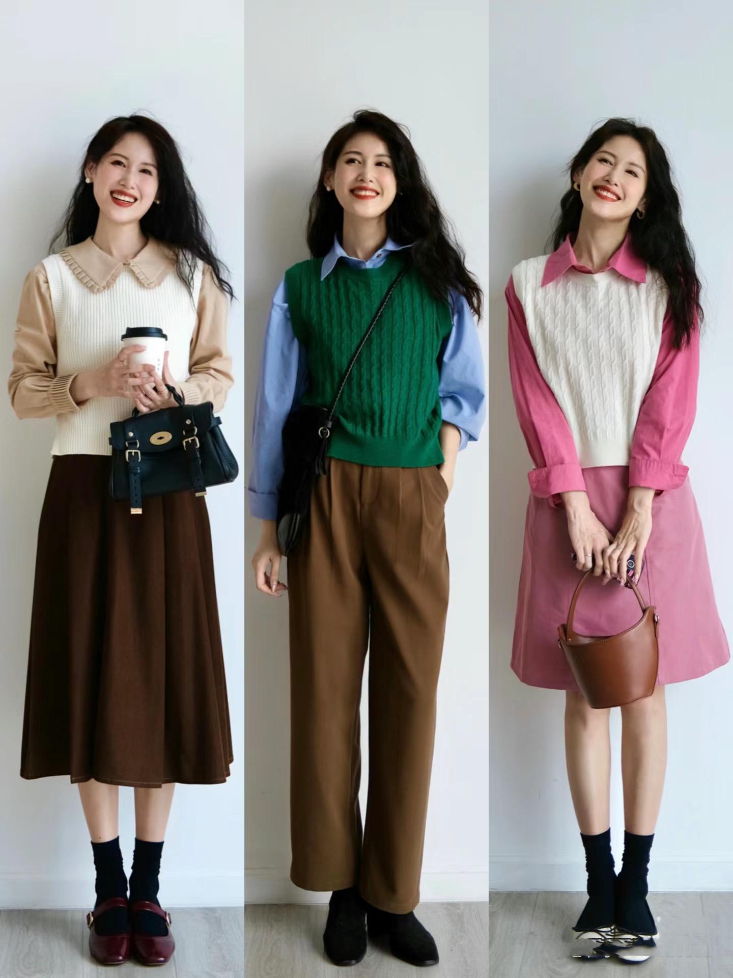當我們選擇襯衫+馬甲的組合時,面料挺闊的襯衫、與軟糯細膩的針織馬甲,也可以豐富穿搭層次。