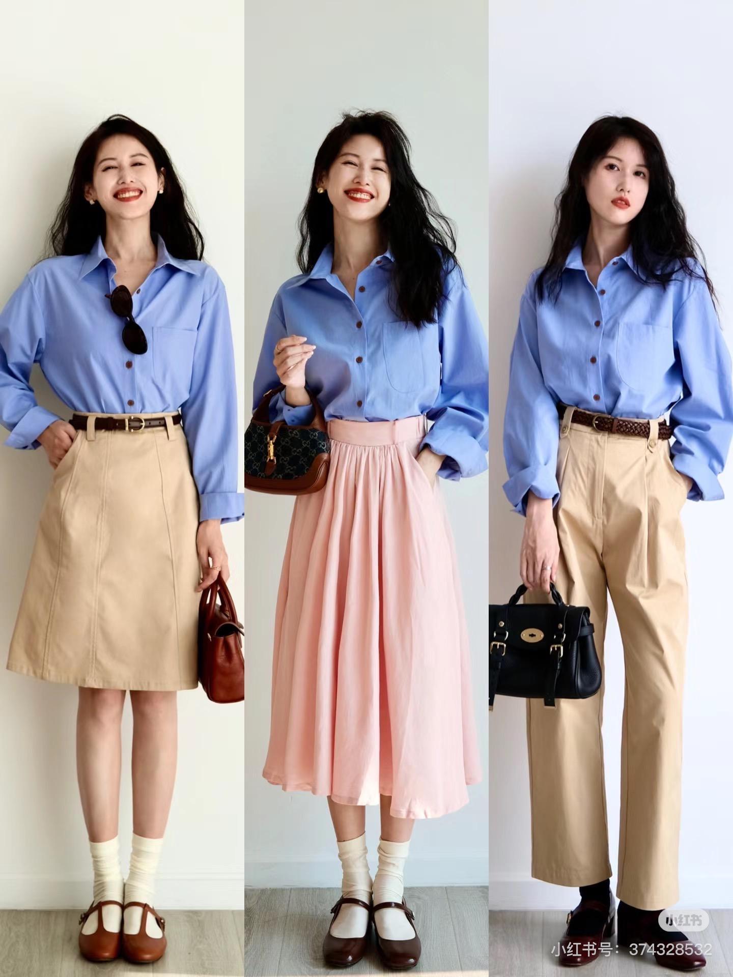 一頭微卷的波浪發,復古且迷人的妝容,讓藍色襯衫的穿搭更具風情。入秋後這種基礎款的藍色襯衫,撞上卡其色直筒褲,真的高級醒目。