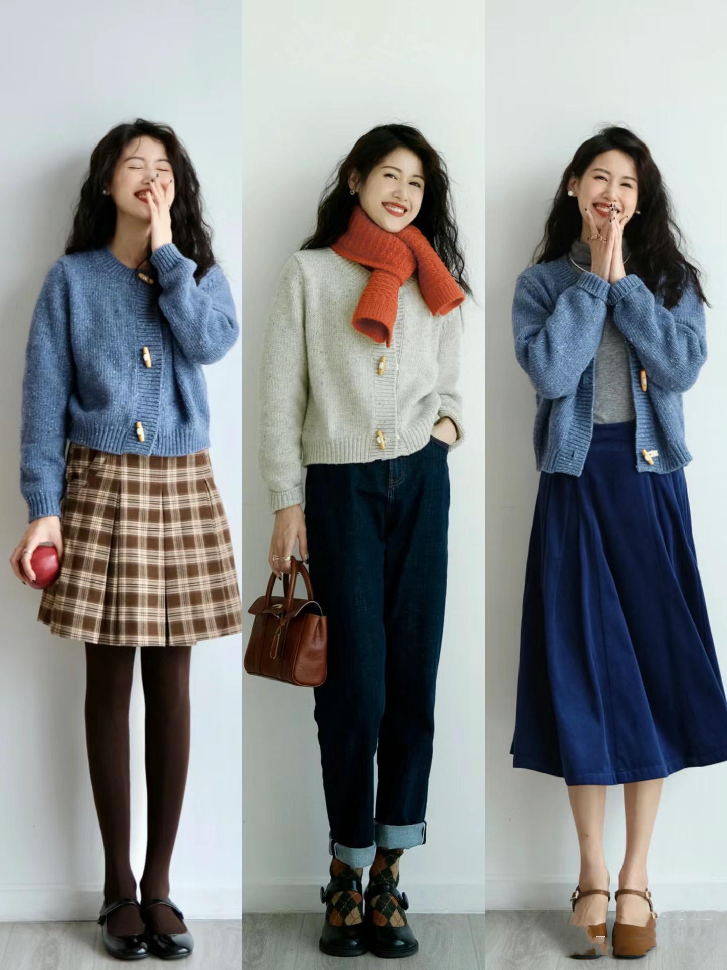 牛角扣裝飾的針織衫,帶着學院風的氛圍,讓我們穿搭擁有更減齡的效果。學院風針織衫配格子半身裙,放入回到了校園時代一般。