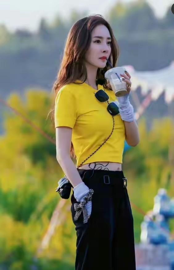 T恤搭配高腰褲的話,建議選擇露臍款T恤,好比楊冪這身“黃色T恤+黑色高腰褲”造型,不僅凸顯出身材凹凸感,還打造出三七分完美身材比例,從而襯得楊冪整個人高挑纖瘦、幹練利落。
