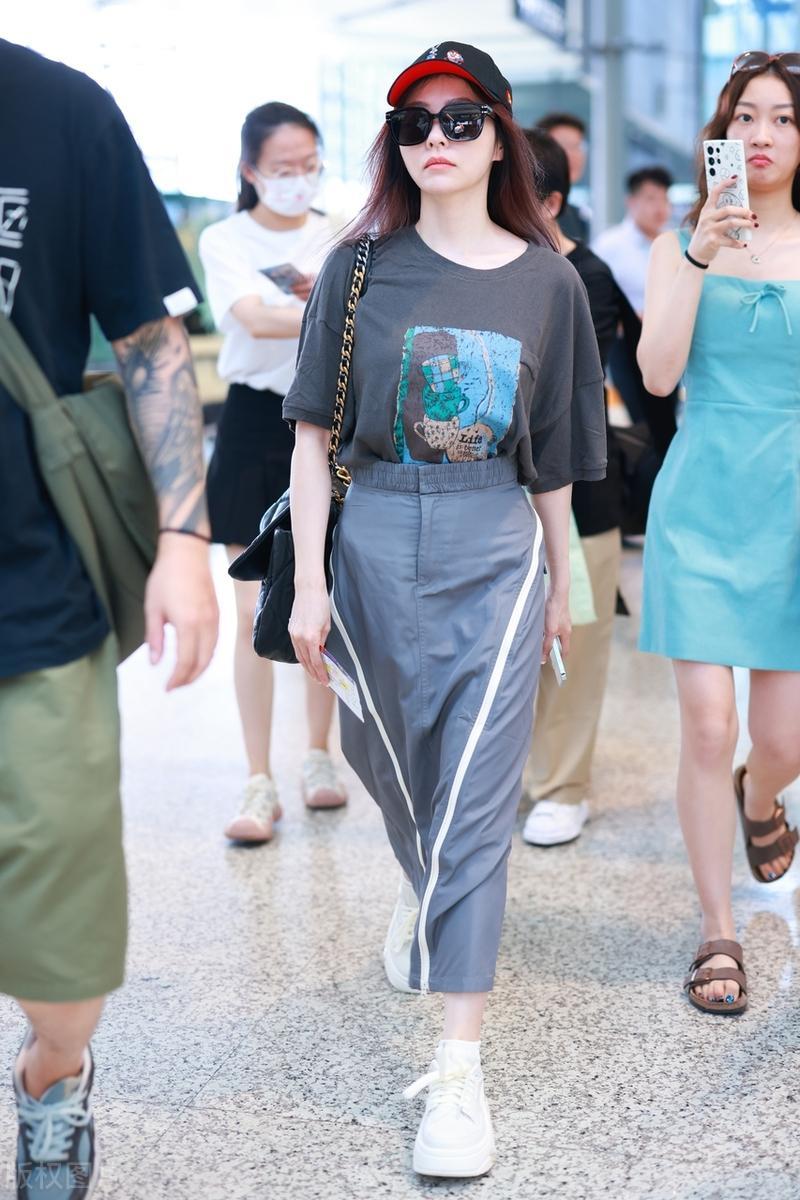 作爲一名歌手,張靚穎背後也有造型團隊。她的私服穿搭,必然經過了精心的安排。看似簡單的灰色卡通印花T恤,配修身的工裝風半身裙,休閒又酷颯。