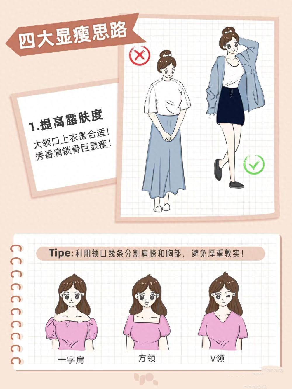 這時候適當輕盈的露膚,利用領口線條分割肩部和胸部,就可以避免厚重敦實感。比如一字肩、大方領、或者V領的上衣,都可以幫助我們秀出香肩鎖骨更顯瘦。