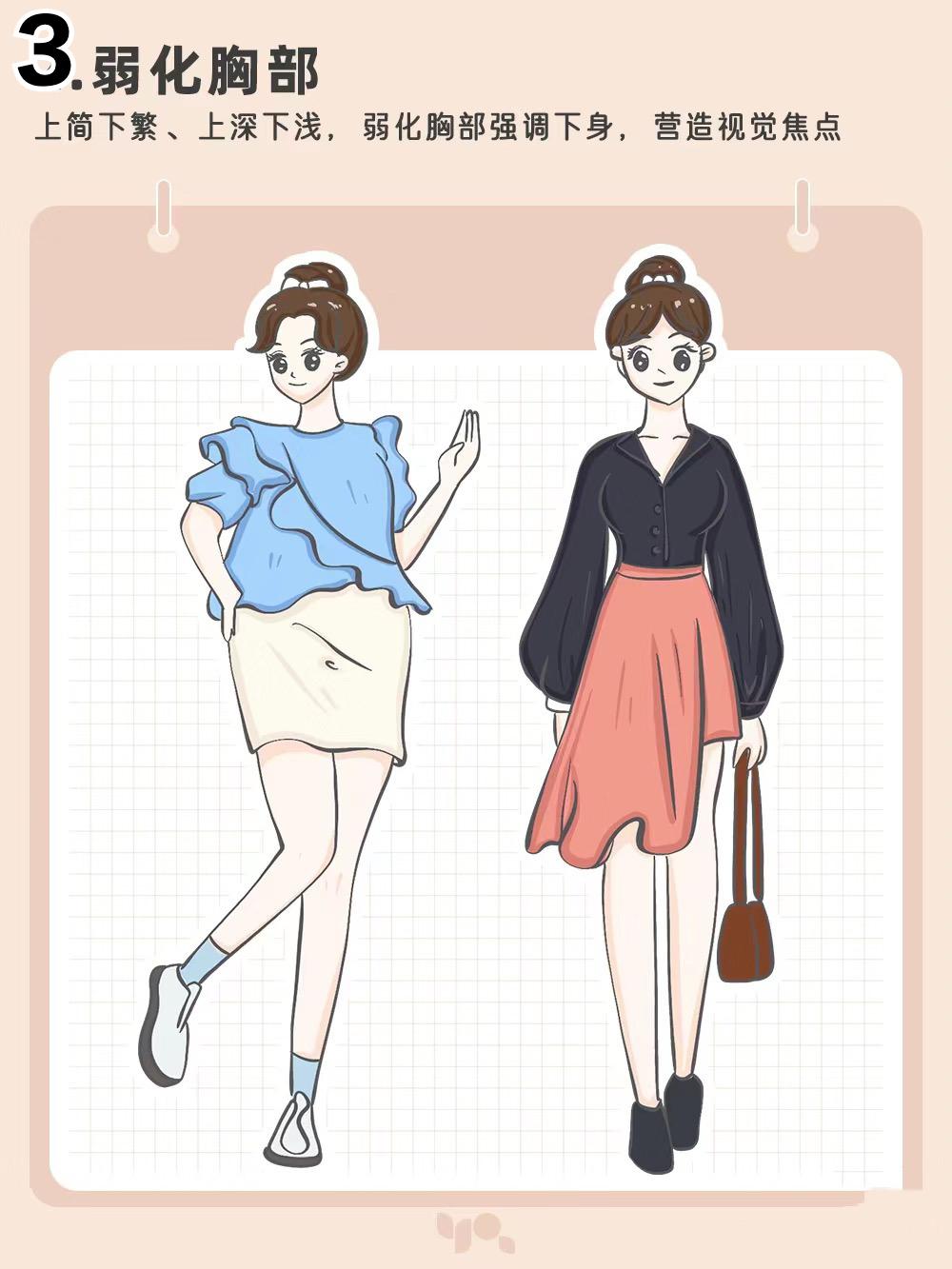 胸大的女生,想要通過穿衣顯小,一定要學會弱化胸部線條。這時候上簡下繁、以及上深下淺的穿搭,都可以掩蓋胸大的問題。