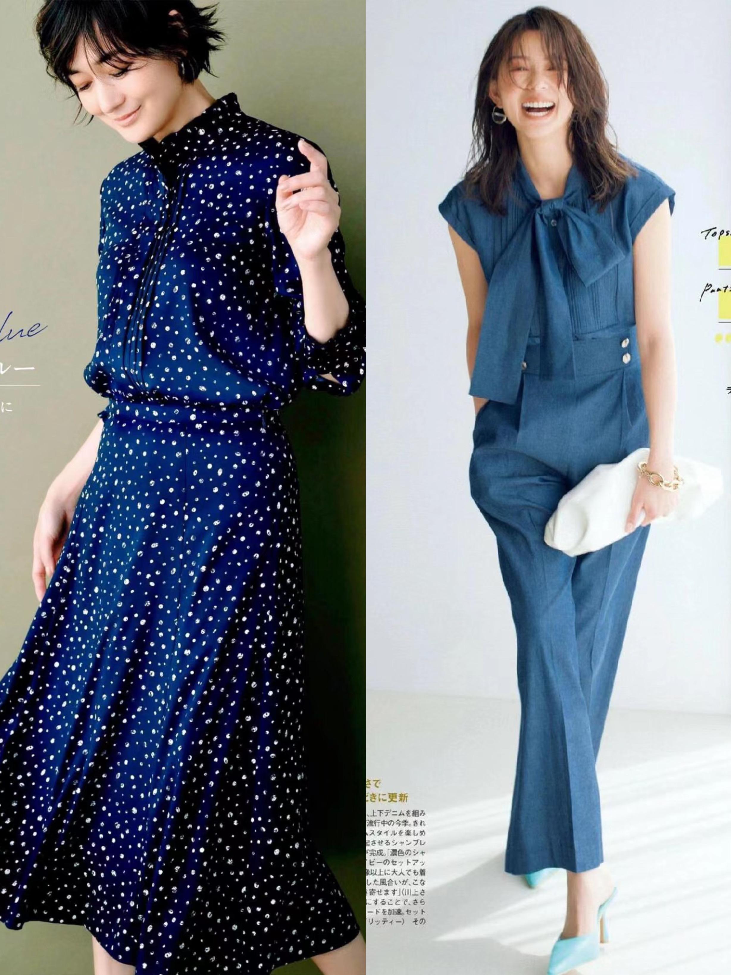 有些年紀偏大的女士,就更喜歡復古、大氣,帶有國運之美的穿搭。配色上不喜歡太沉靜,就可以選擇亮度在線的深井藍。