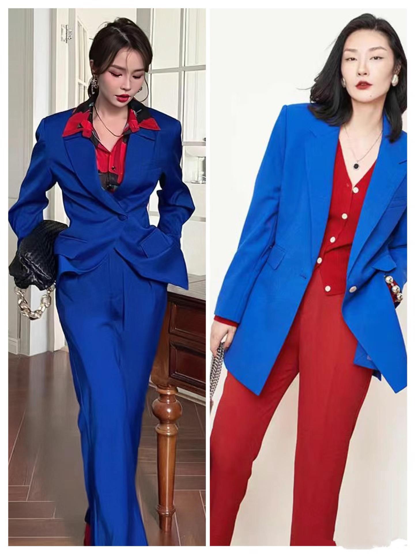 藍色西服外套,版型挺闊、自帶強勢美。內搭紅色馬甲+西裝褲,既明豔又顯白。藍色西服外套小闊型剪裁,上身也是蠻大氣。