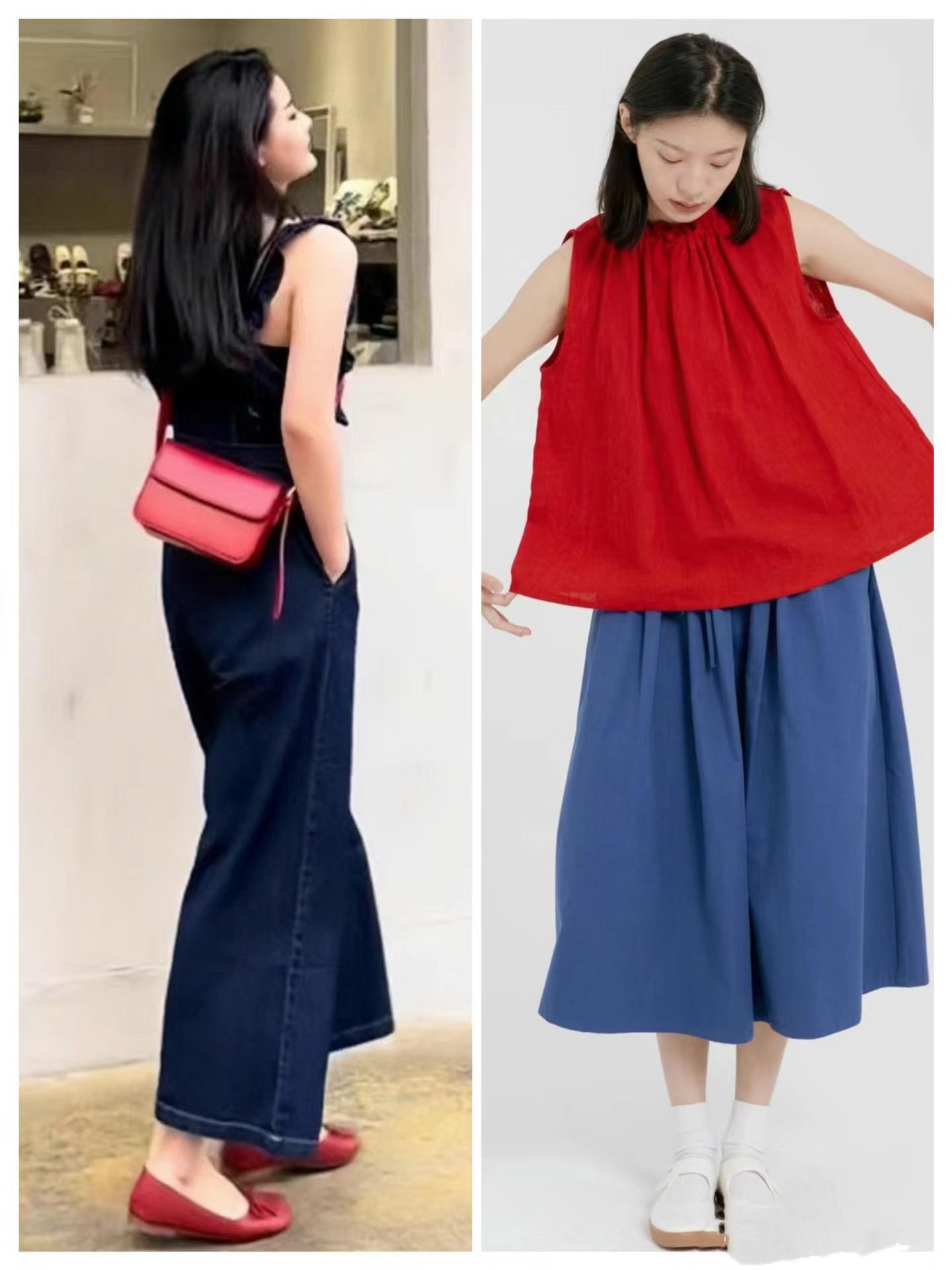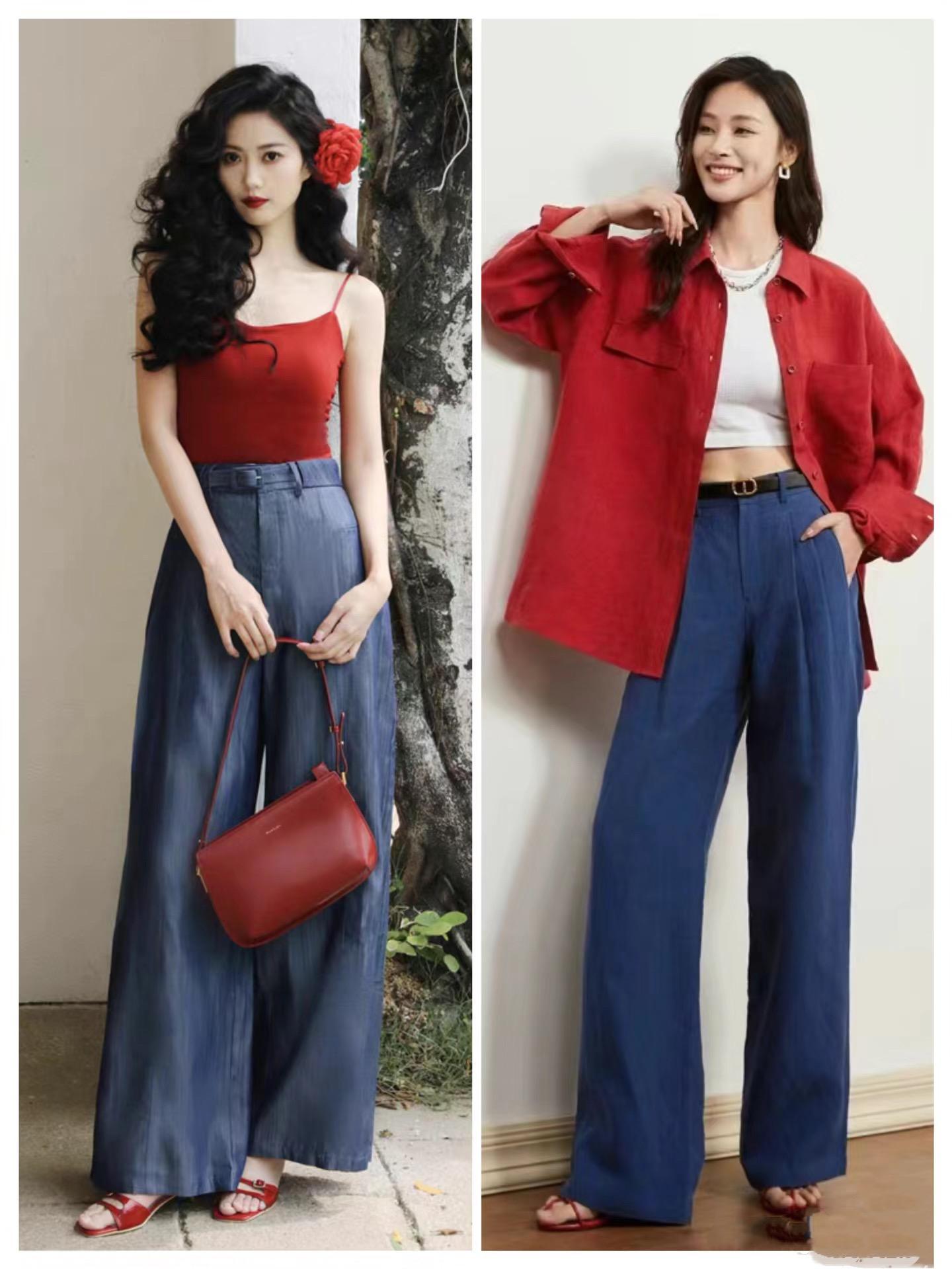 同樣的紅藍配色,高飽和度的配色好醒目。挺闊的紅色襯衫,配上小背心、藍色直筒褲,帥氣又拉風。藍色直筒褲版型垂順,顯的雙腿修長。