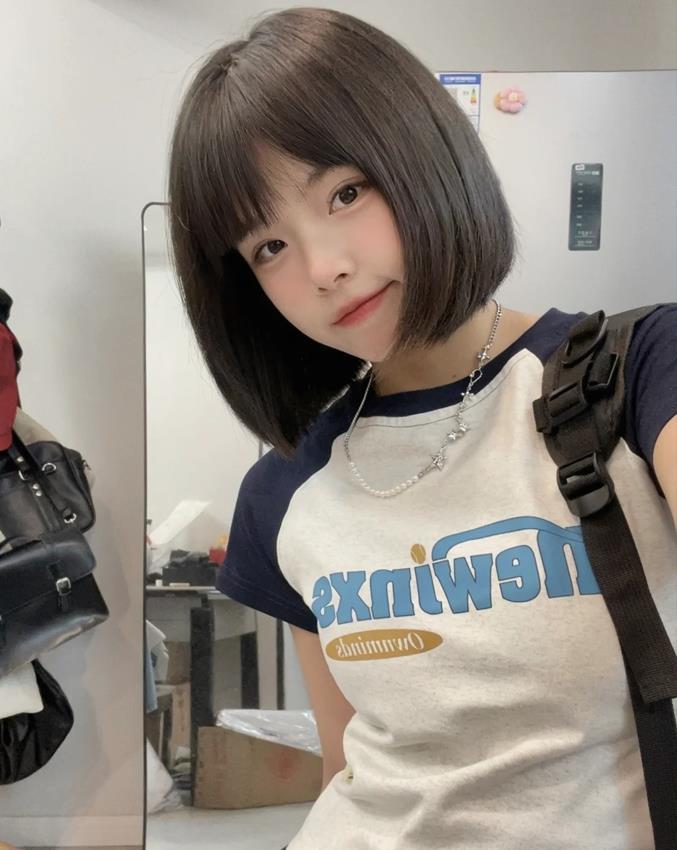 齊劉海+短髮波波頭,方圓臉女生可以嘗試起來的一款髮型,髮尾進行了一刀切,一點都不會給人呆板感,髮尾微微進行內扣,修飾臉型的同時,還瘦臉,主打一個減齡,少女範十足。
