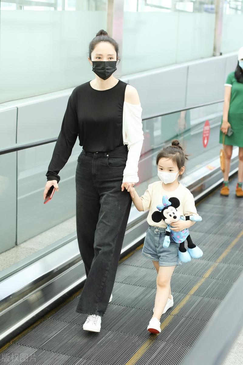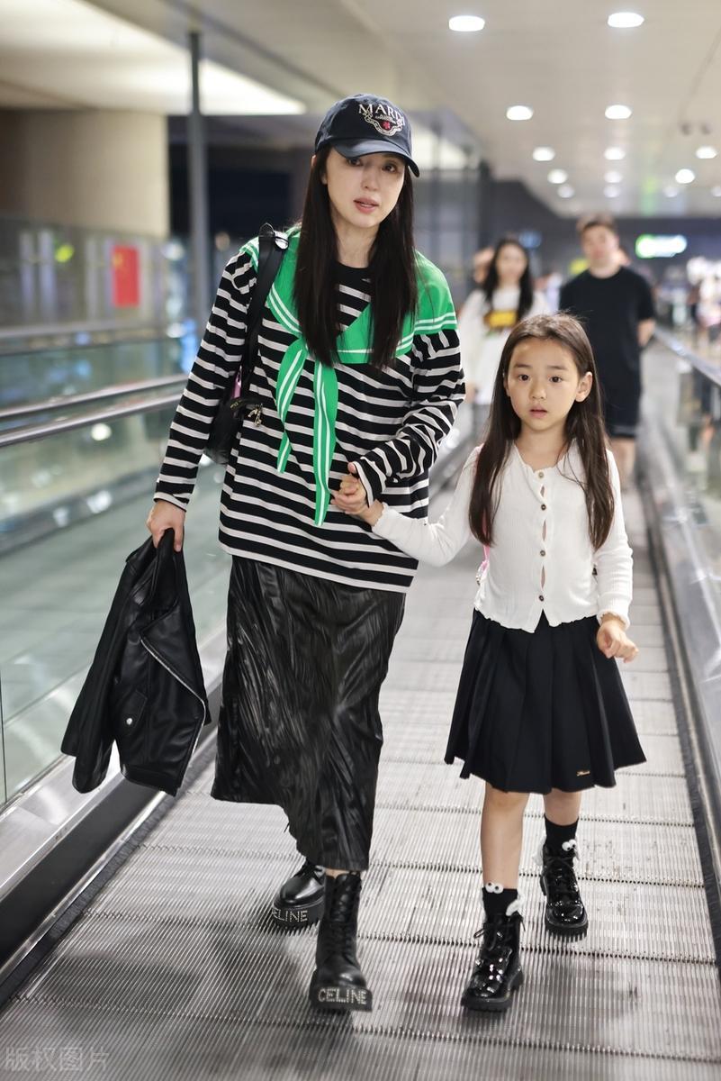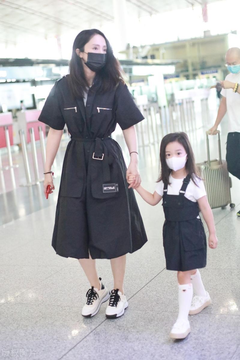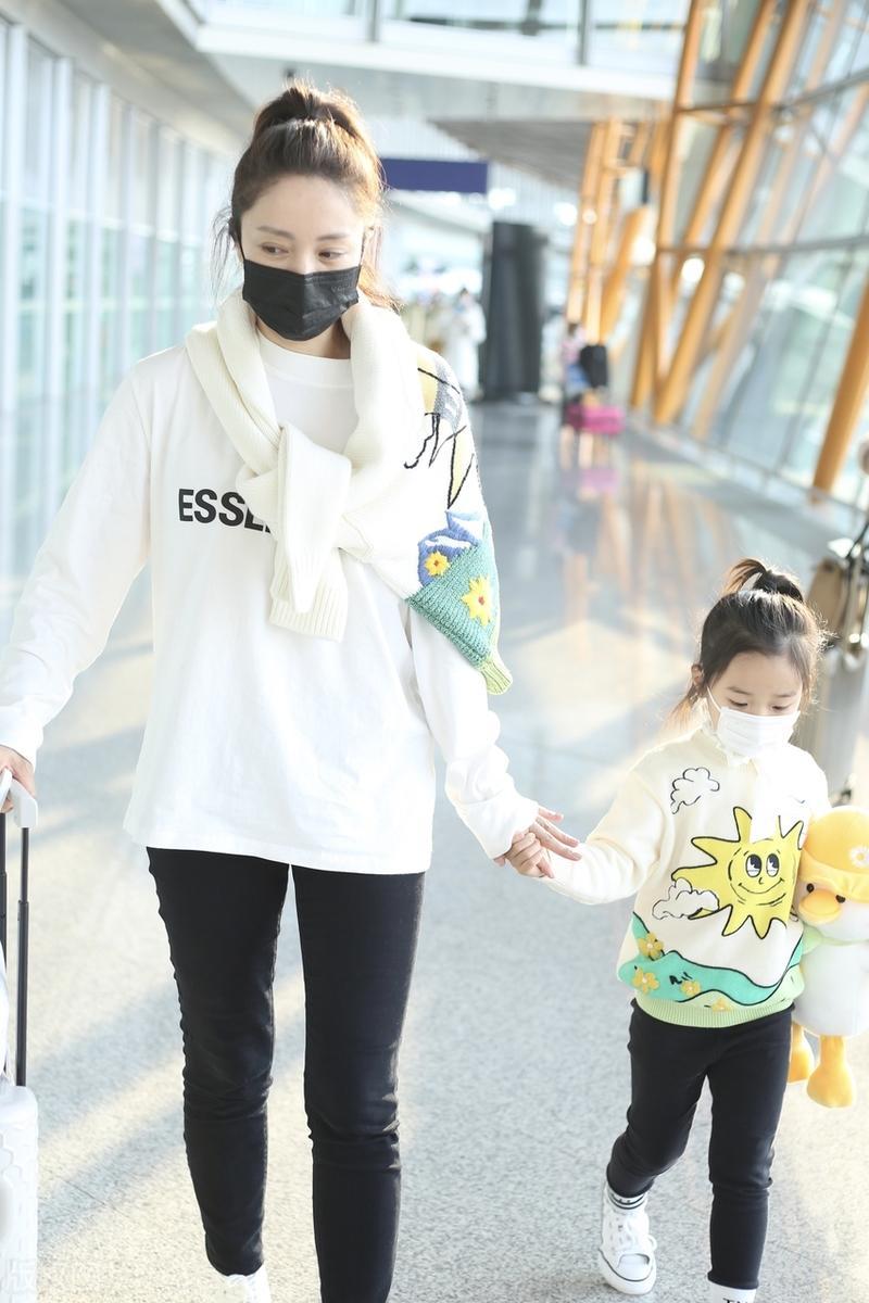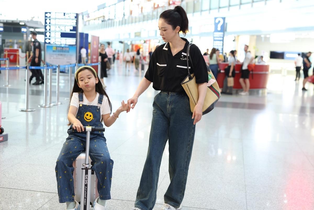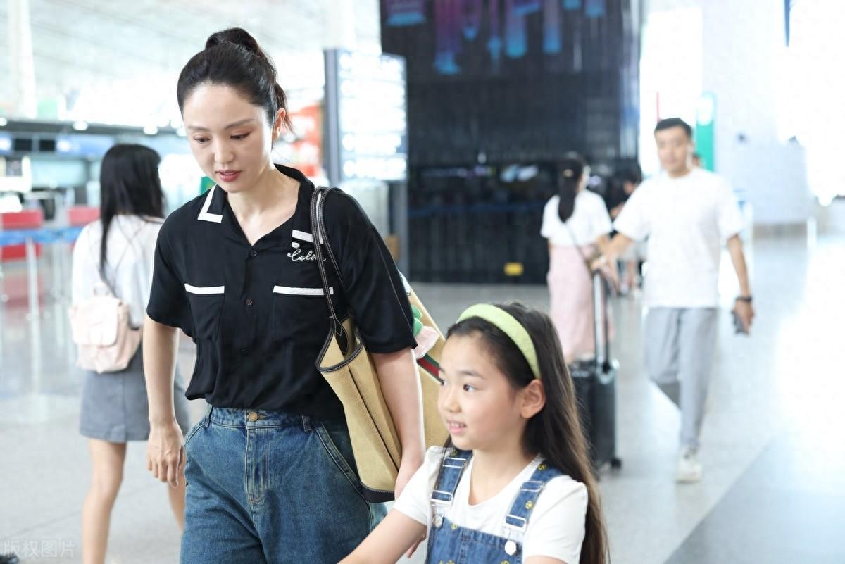 44歲董璇帶女兒走機場,8歲小酒窩穿揹帶褲留披肩發,越來越像媽