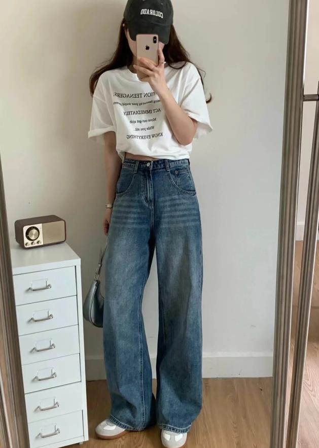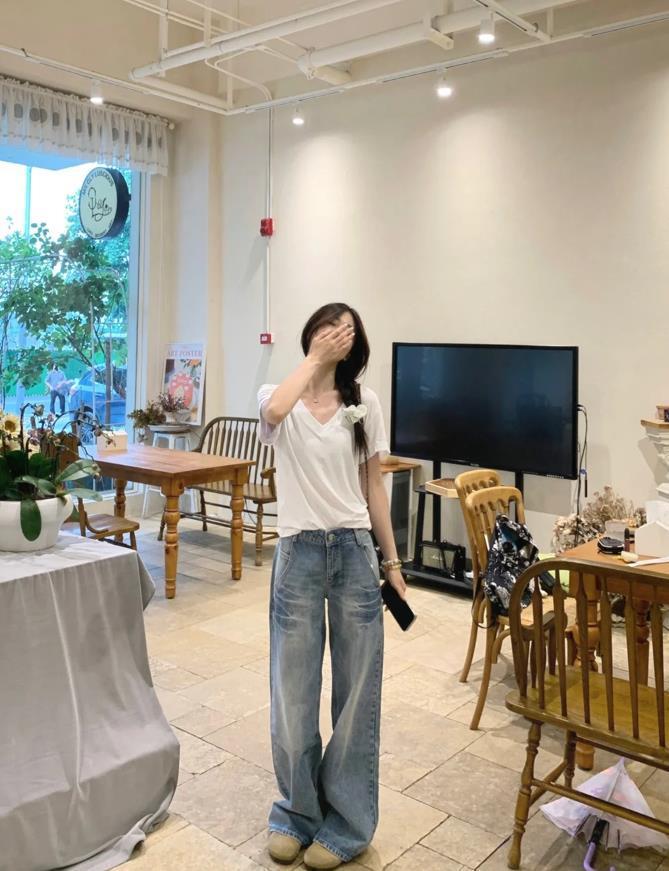 白色v領短袖t恤,很基礎簡約的款式,搭配拖地牛仔闊腿褲,這樣的褲子可太顯瘦了,也能巧妙拉長腿部線條。小個子的女生,記得要把腰線提高起來,這樣纔不至於拉低個子。