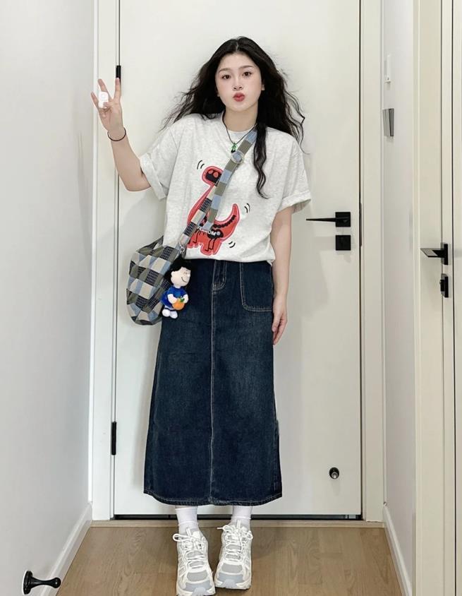 微胖的女生,適合鬆弛感的穿搭嗎?答案當然是可以的,基礎款短袖t恤+牛仔半身直筒長裙,上下的版型都是寬鬆的,給足了身材包容性,藏肉更顯瘦。搭配起一雙運動鞋,少年感中又帶着一點休閒範。