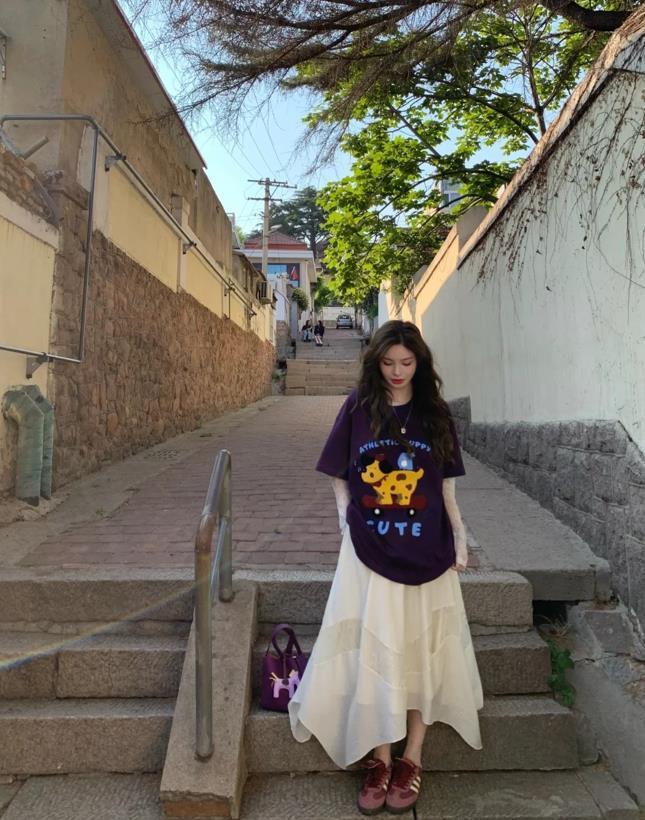誰懂這種鬆弛感帶來的慵懶和隨性呢?在夏天,就是要穿得舒適自在一點,衣服版型儘量選擇寬鬆的,這樣才更瘦身和藏肉。T恤和半身長裙,還配了一雙運動鞋,可太休閒好看了,也很溫柔。