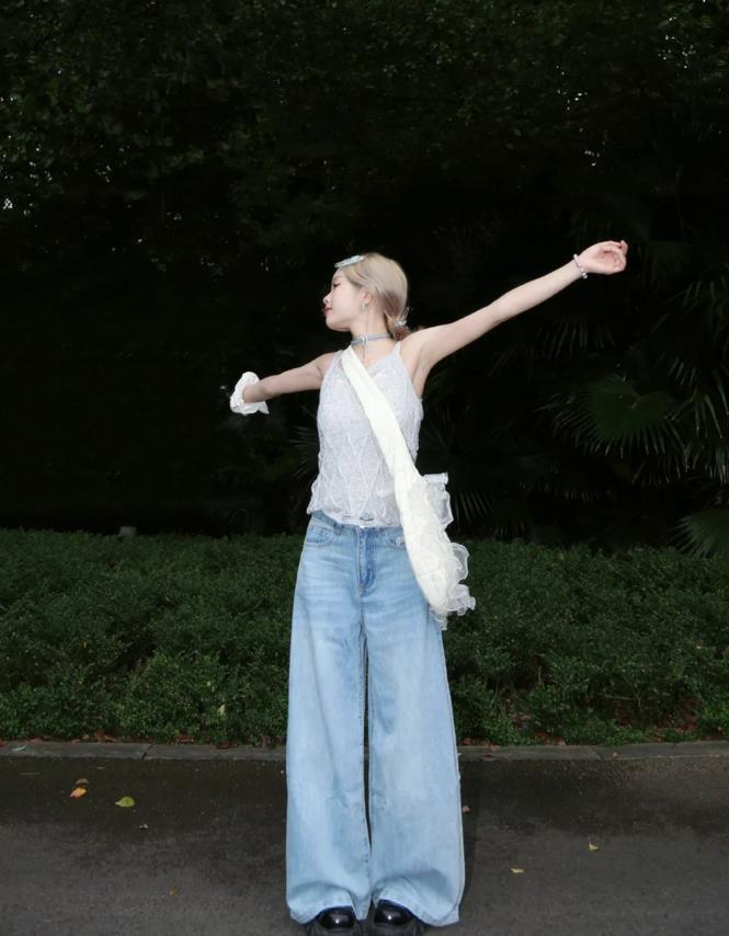 白色背心+牛仔闊腿褲,很適合夏天的鬆弛感穿搭,最喜歡這條褲子了,寬鬆的褲型,加上水洗牛仔藍,很清爽乾淨,垂墜感十足的面料,無形間就可以把雙腿比例拉得很修長。