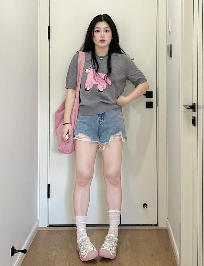 又甜又酷的搭配,看起來實在是太愛了,淺灰色針織短袖,很柔軟舒適的材質,加上是小短款的長度,這對於小個子女生來說也是非常友好的。搭配一條牛仔短褲和運動鞋,既休閒舒適又自在。