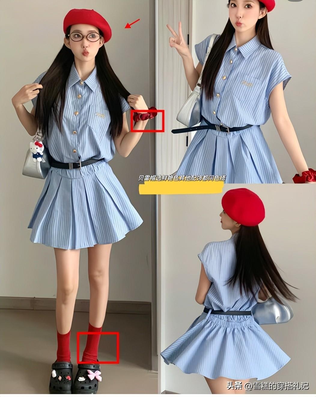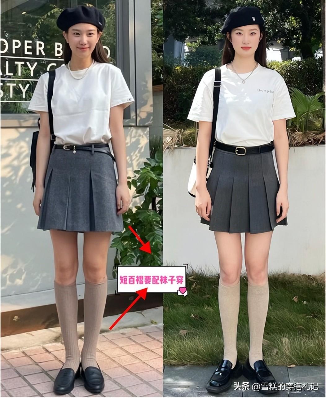 ❶貝雷帽:T恤+百褶裙,溫柔中帶點甜美