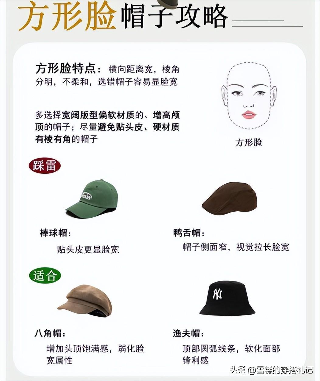 而方形臉是橫向臉距離寬,棱角分明,不柔和,特別是下顎線的位置比較寬,選錯帽子容易顯臉大有寬。佩戴帽子要選寬闊版型偏軟材質的、增高顱頂的帽子,比如八角帽、漁夫帽等,不要碰貼頭皮且棱角分明的帽子,像鴨舌帽、棒球帽不推薦。