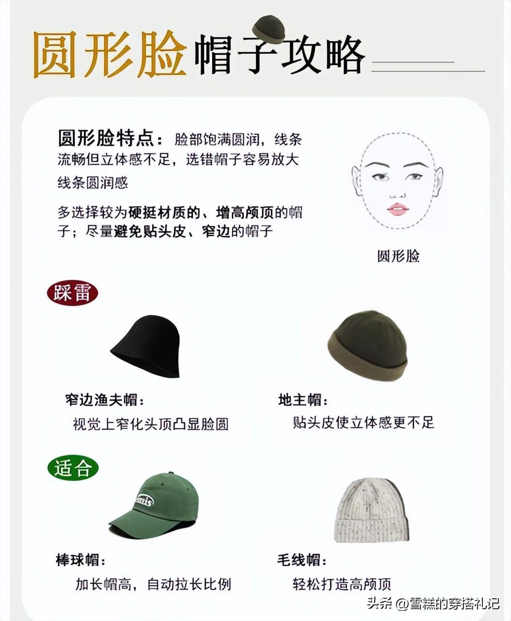 圓形臉的臉部曲線圓潤,面部都很飽滿,線條流暢但立體感不足,選錯帽子容易放大,選錯帽子容易顯臉胖,太有肉感。推薦帽子的硬挺以及有高顱頂的材質,選棒球帽、毛線帽都可以,不要戴貼頭皮窄邊款,像漁夫帽、地主帽都不可。