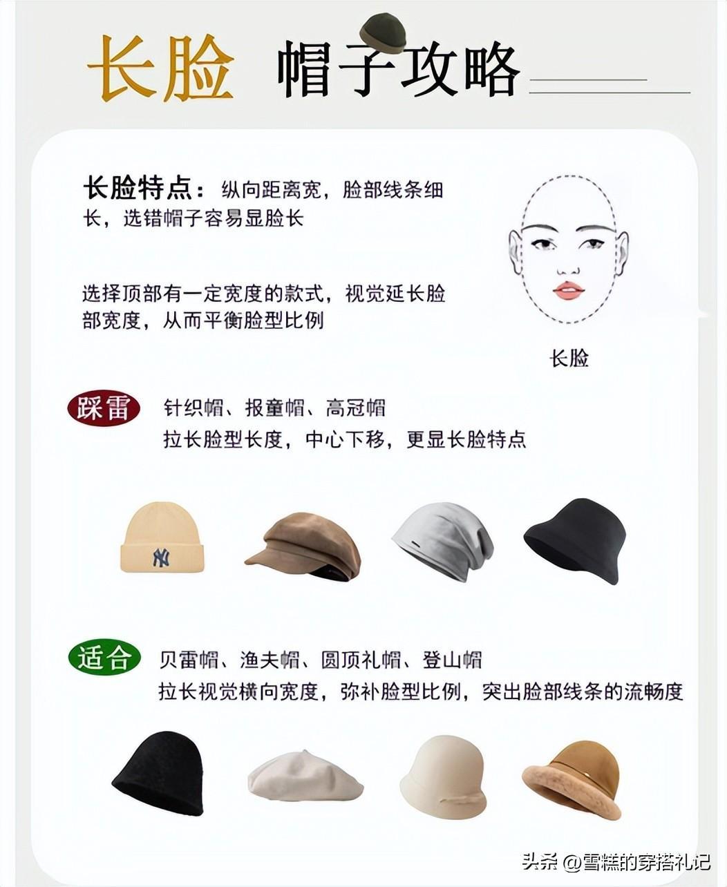 長形臉和方形臉相反,縱向距離寬,臉部線條細長,帽子要是沒選對,會顯臉更長。戴帽子要學會選擇頂部有一定寬度的款式,視覺延長臉部寬度,從而平衡臉型比例,像貝雷帽、禮帽登山帽都可以,它能有視覺拉寬臉部寬度的作用,不要碰針織帽、報童帽、高冠帽。