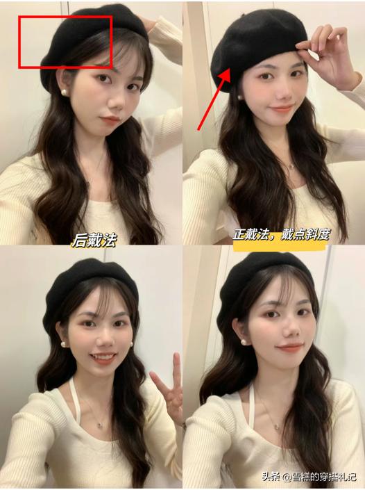 貝雷帽在很多溼毛巾中非常受歡迎,是因爲貝雷帽有不同的佩戴方式,這些佩戴方式也能讓貝雷帽呈現不同的感覺。貝雷帽第一種佩戴,是採用正戴,帽子套上的時候有一點傾斜,整個風格是優雅復古的,另外的佩戴方式是後戴法,這個戴的時候,頭髮肯定要有劉海的設計,才能顯得自然好看,風格溫柔有氣質。