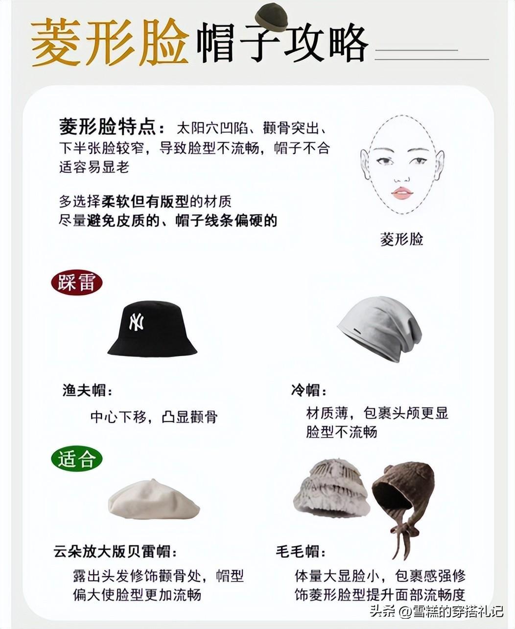 菱形臉的特徵是面部的線條不是很流暢,有着太陽穴凹陷、顴骨突出的問題,而下半張臉會偏窄。建議在佩戴帽子的時候,不要選擇皮質、帽子線條硬的單品,比如漁夫帽、冷帽不建議戴,而是要選比較柔和且有版型的材質,可以多戴貝雷帽或毛毛帽。