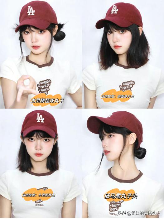 鴨舌帽戴法要顯得不一樣,和髮型的設計相關,每個髮型都能帶給穿搭不同味道。走俏皮可愛的路線,可以採用雙丸子頭頭髮的兩側就點碎髮,更自然好看,若不想有太多的修飾,讓頭髮自然的披下來,根據臉型選頭髮是別耳後還是放前面,臉型大就放前面修飾,臉型小就別耳後;想要低馬尾更有氣質,扎個低丸子頭。