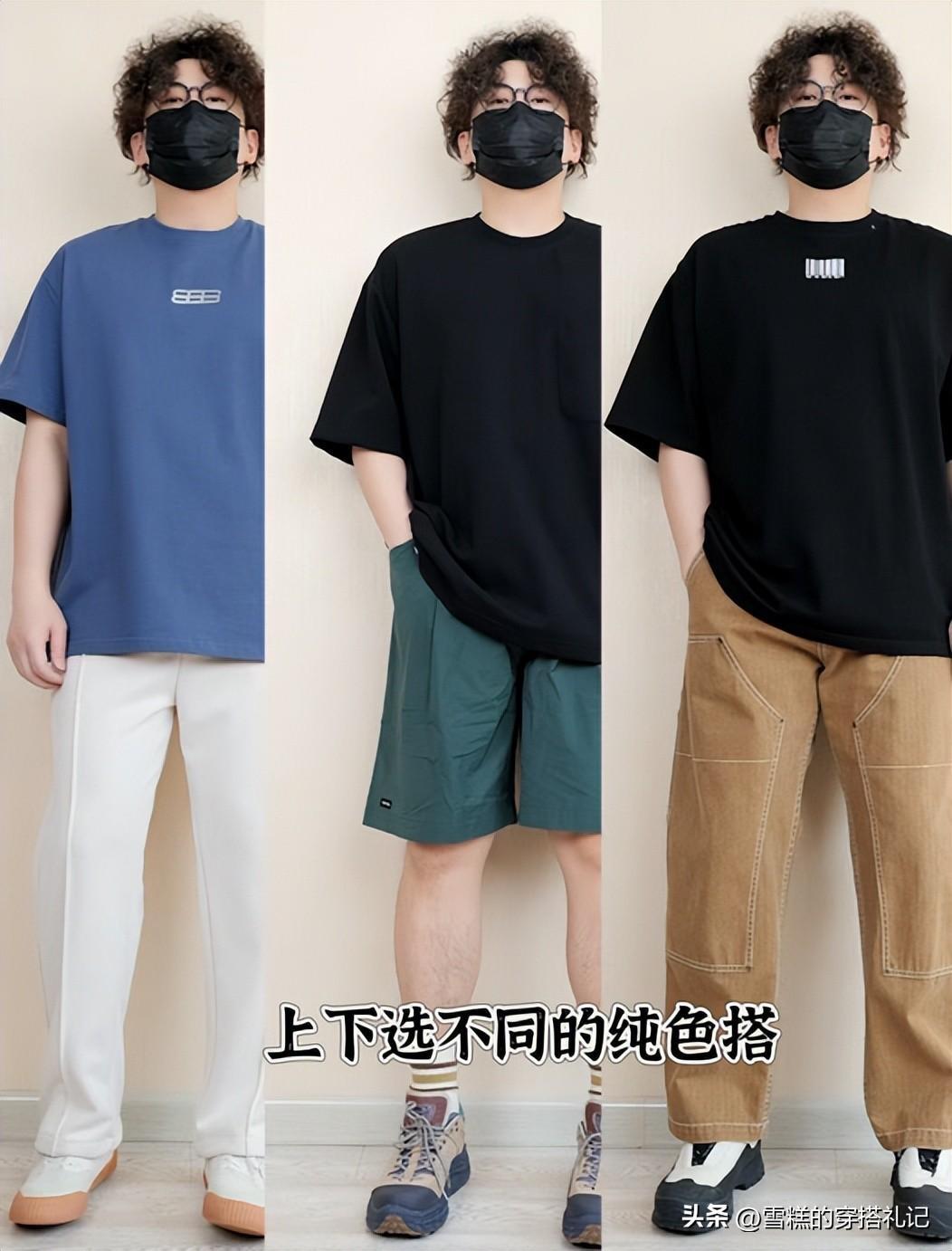 前面有提到男人不要穿花色的衣服,所以在顏色上,穿簡約純色的款式流行。不管上下搭配什麼顏色的衣服,確保整體穿搭的用色不超過三種流行,身材胖的男人,上身配純黑色的T恤下身配淺色下裝,形成層次差異,用顏色獲得顯瘦度,還不會顯沉悶。贅肉少的男人,就可以多穿淺色藍配白或者全身白都可。