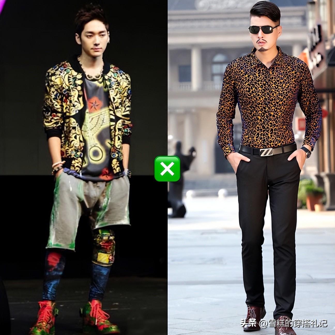 除了緊身的穿搭方式之外,還有花色搭配,這種衣服是誰上身誰醜的表現,尤其是帶有黃色元素、豹紋的花色,就像非主流時代街頭上的二流子,顯得男人沒有文化又沒有美感,花色對皮膚黃的男人也不友好,穿上顯得膚色黑,給人留下很邋遢不乾淨的印象。