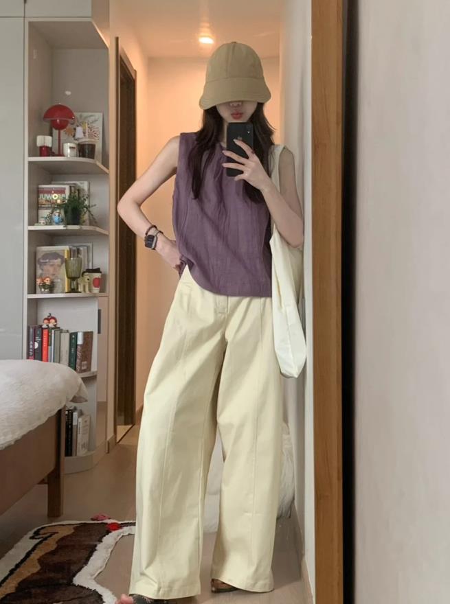 寬肩也可以穿的無袖背心,記得要選擇版型寬鬆些的,這樣才能穿得更舒適自在,也可以巧妙遮掩起身上的贅肉,搭配起一條白色直筒長褲,這樣的褲子,一點都不顯胖,反而是很顯瘦。