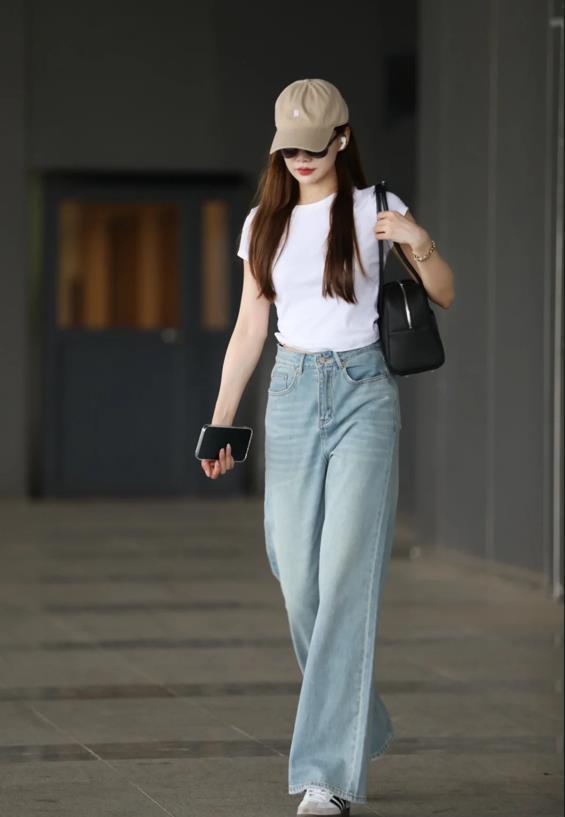 年齡越大的女性,我個人是更建議選擇一些基礎款來穿,白色短袖t恤,搭配水洗牛仔藍直筒褲,這種版型的褲子,最不挑人穿了,也很顯瘦和藏肉。出門的時候,搭配起一雙運動鞋,可太休閒舒適了。