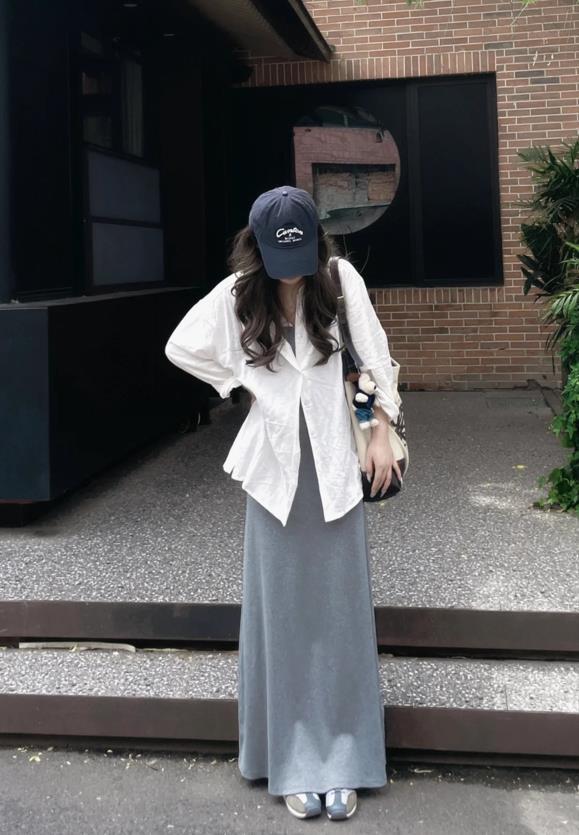 40歲的女人,在選擇衣服款式上,可以不妨多給自己選擇幾條半身長裙來穿,梨形身材很適合這一條裙子,面料質感和垂墜感都非常不錯,版型也很不錯。穿起來就顯瘦,搭配一件白色襯衫,白色+灰色的配色,也太時髦耐看了。
