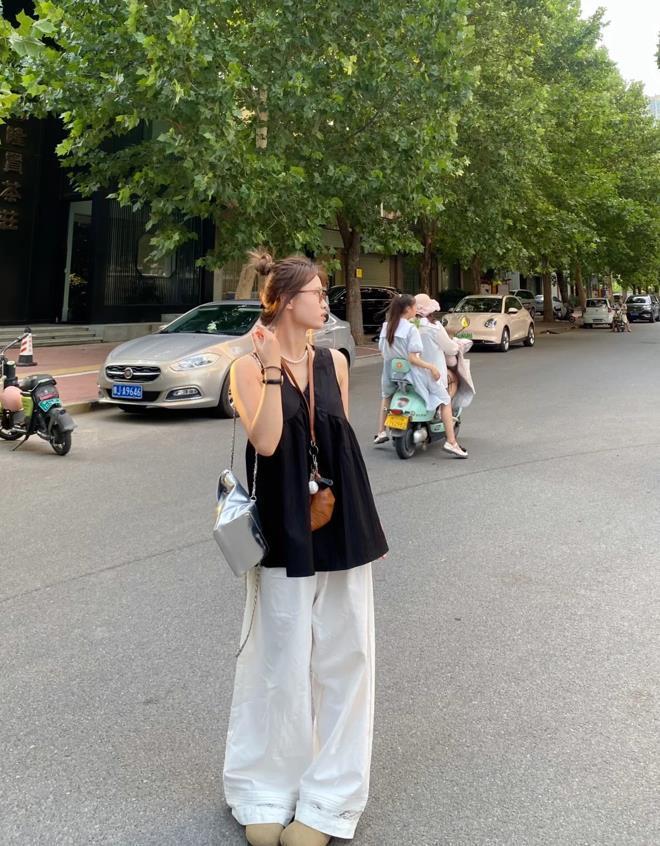 黑白配的組合,就是怎麼樣都不會出錯,也十分耐看,40歲的女人,應該多選擇這兩個顏色來穿,簡簡單單就很好看。黑色無袖背心,寬鬆的版型,可太藏肉顯瘦了,搭配同樣寬鬆的闊腿褲,這麼一套組合在一起,鬆弛又隨性。