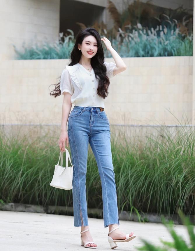 夏天就要無拘無束一些,帶點法式的短袖襯衫+牛仔九分褲,腳下踩着一雙白色粗跟涼鞋,這麼穿真的非常清爽和氣質,上班通勤,或者是日常休閒,都可以這麼穿,覺得不錯的姐妹們就學起來吧!