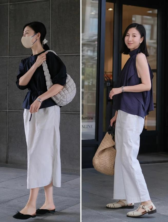 乾淨清爽的藍色,最適合夏天了,作爲一位40+的女性,也是可以穿這個色調的,深藍色深邃且穩重,淺藍色則更不挑膚色,可以很好起到吸睛的作用。