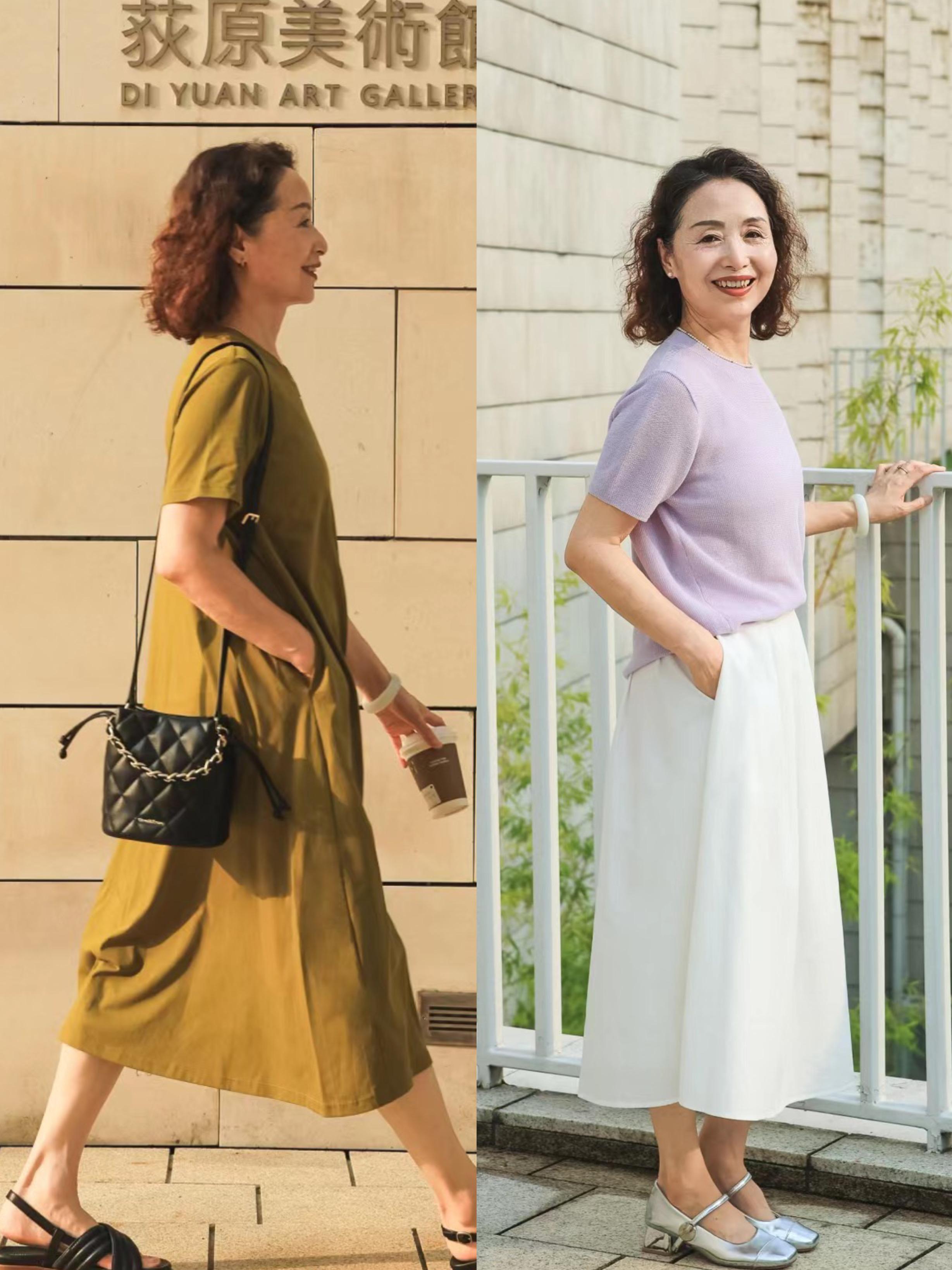 60+的年紀,也可以穿的優雅貴氣。一條淺色系的基礎款T恤,配上醋酸面料的半身裙,優雅貴氣。