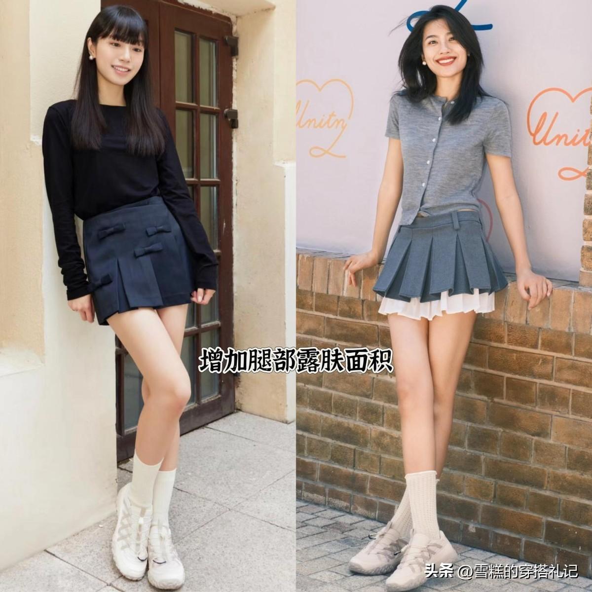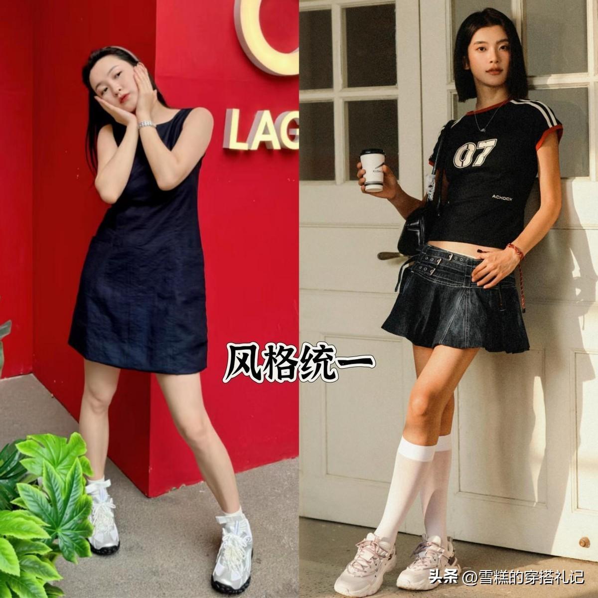 夏天穿芭蕾運動鞋,最重要的就是輕盈感,優先選擇淺色調,搭配順色中筒襪,和短裙進行組合,輕鬆穿出大長腿。