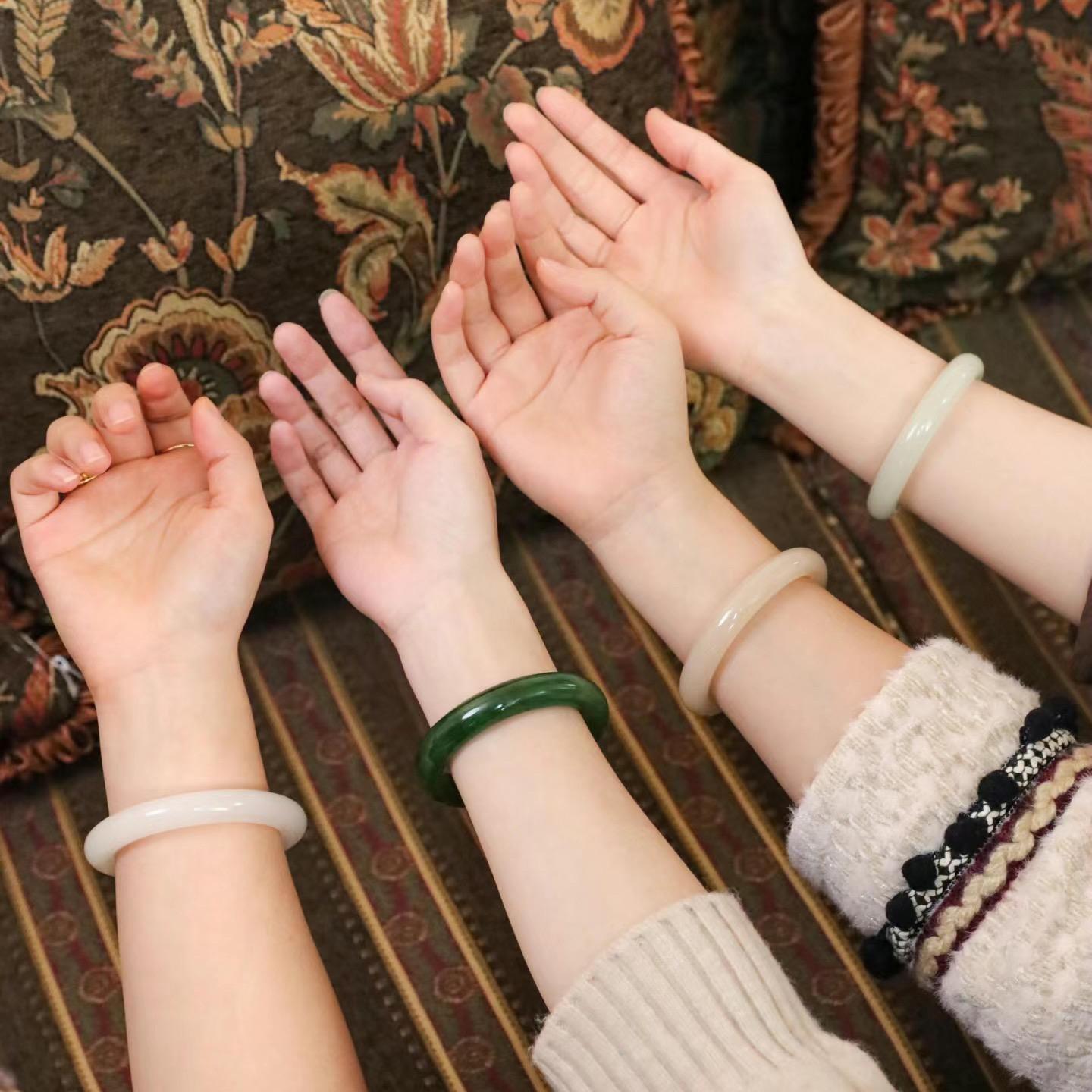 玉手鐲比較細膩,有一種溫潤、大氣的美。玉觸手生溫,是柔和細膩的。