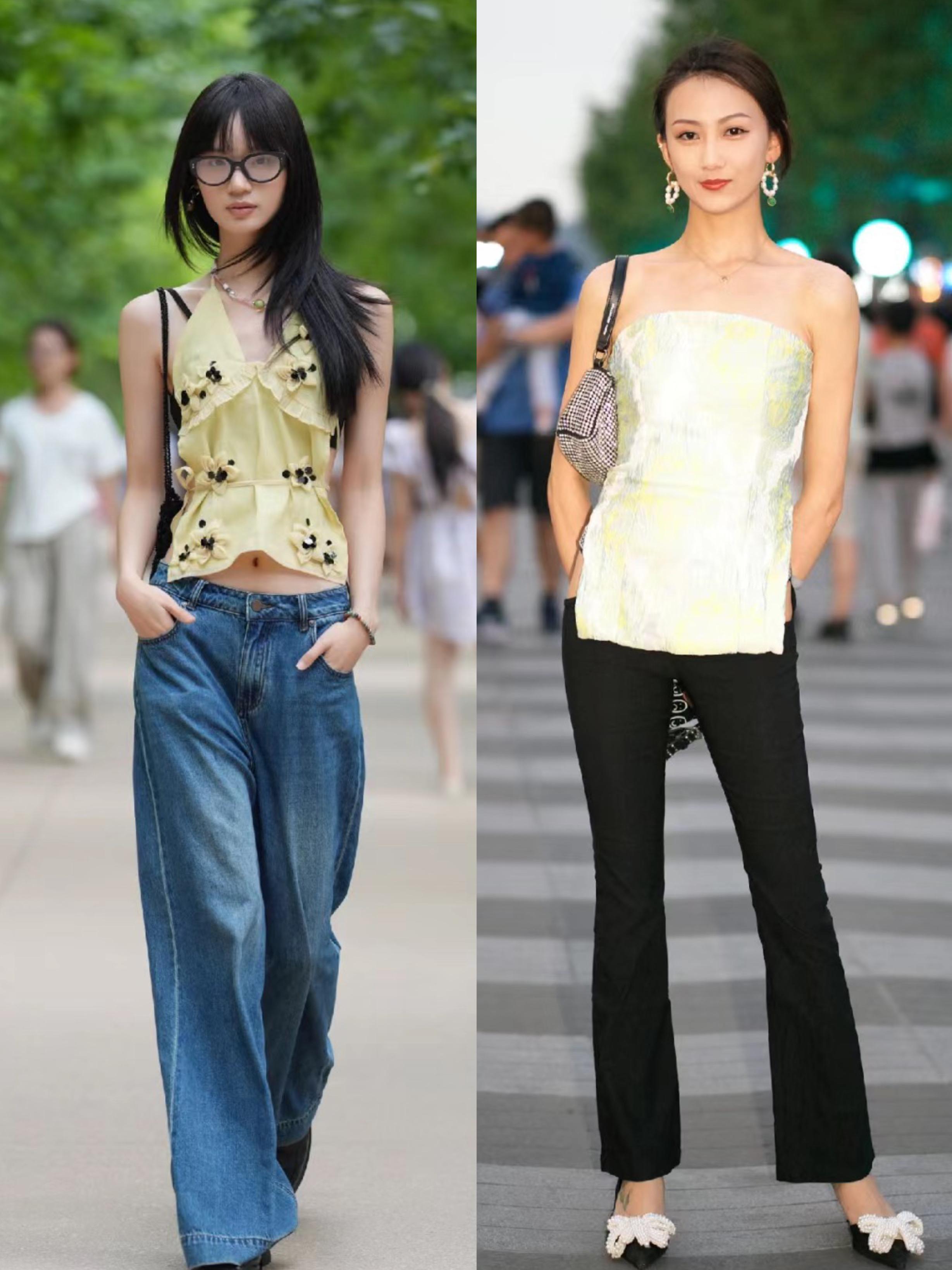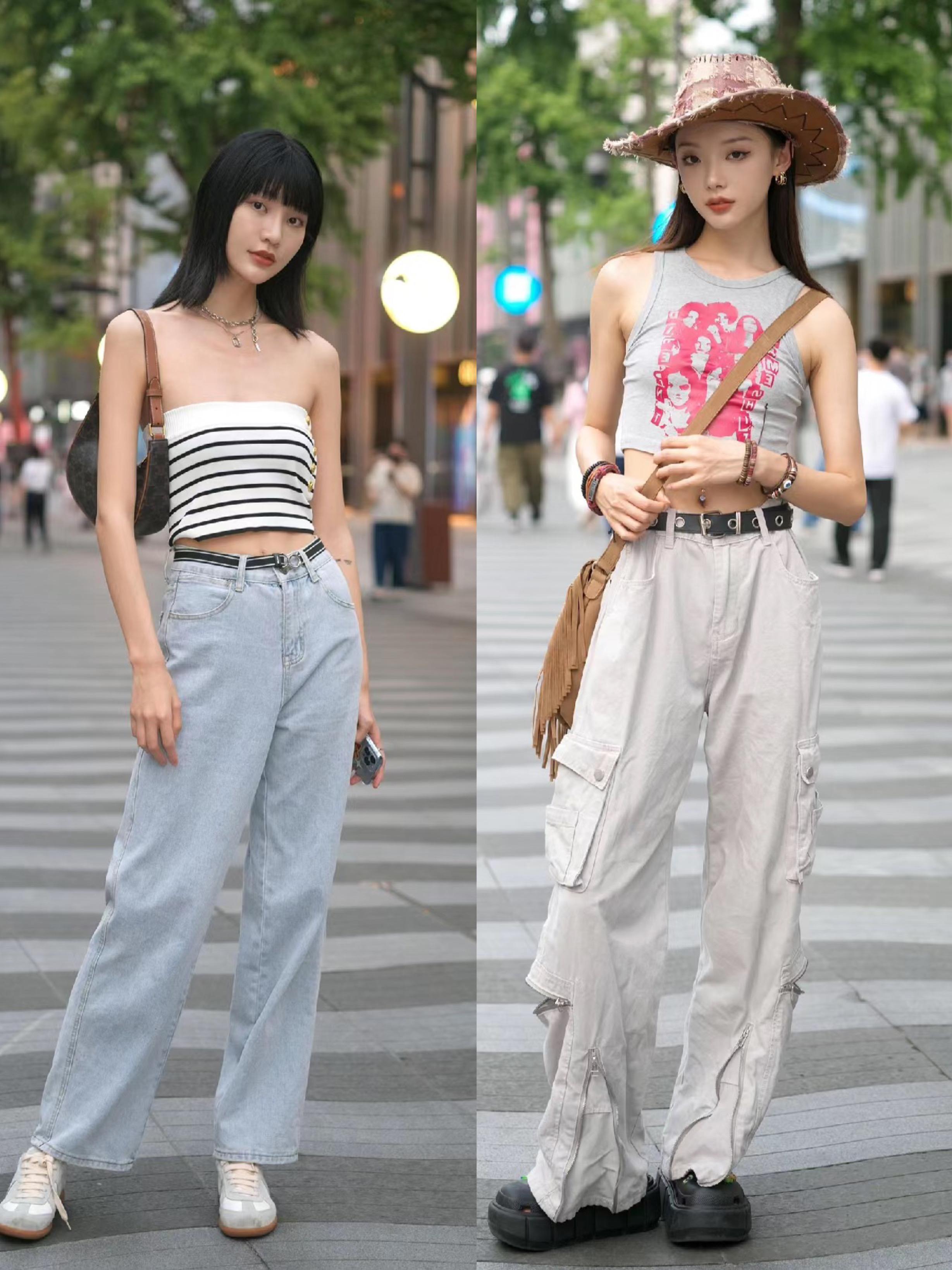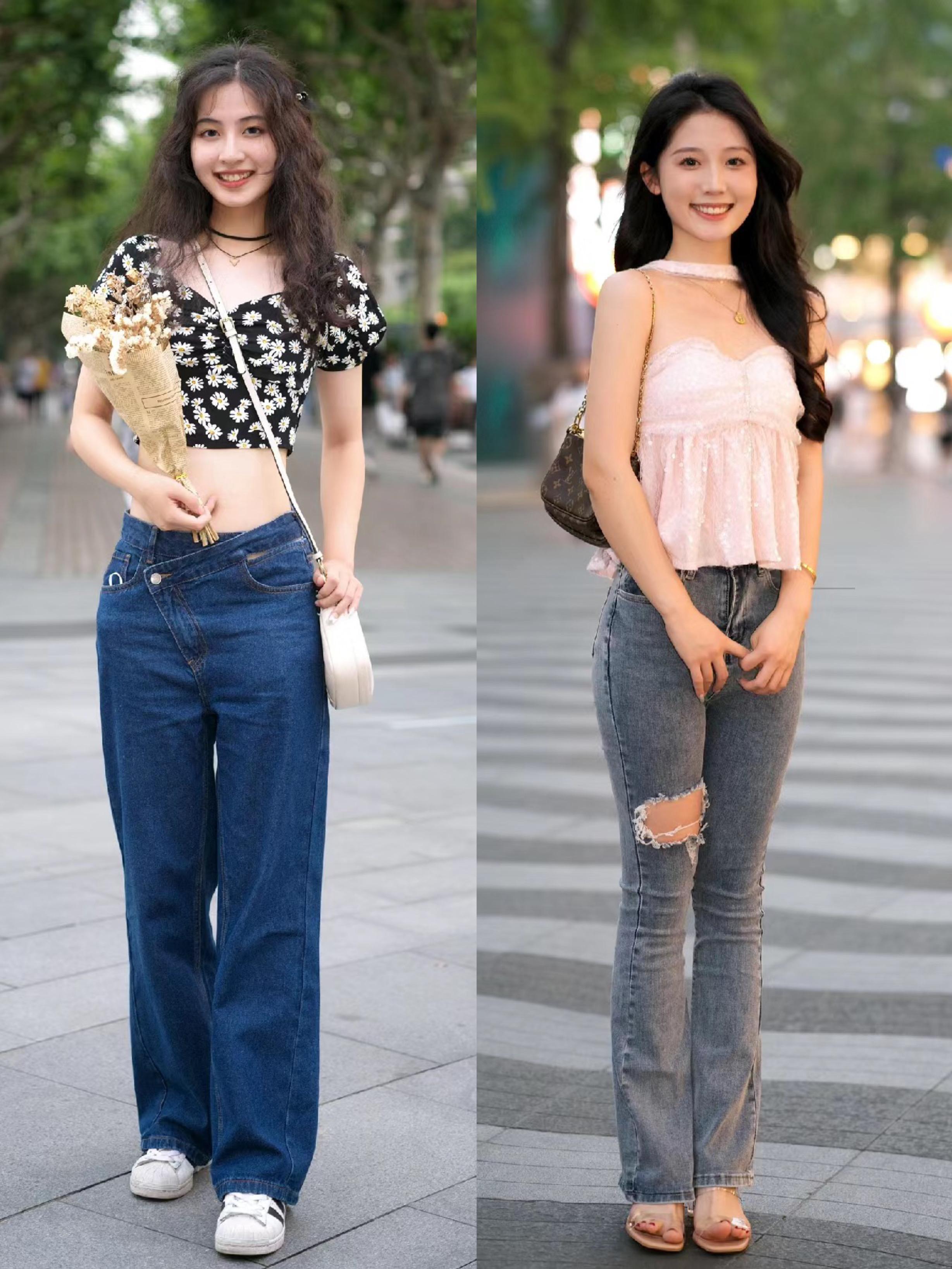 甜美風小背心,可以配高腰的牛仔闊腿褲來穿着。牛仔拖地褲,款式簡潔大方,露出腰部線條、增添了輕盈美。