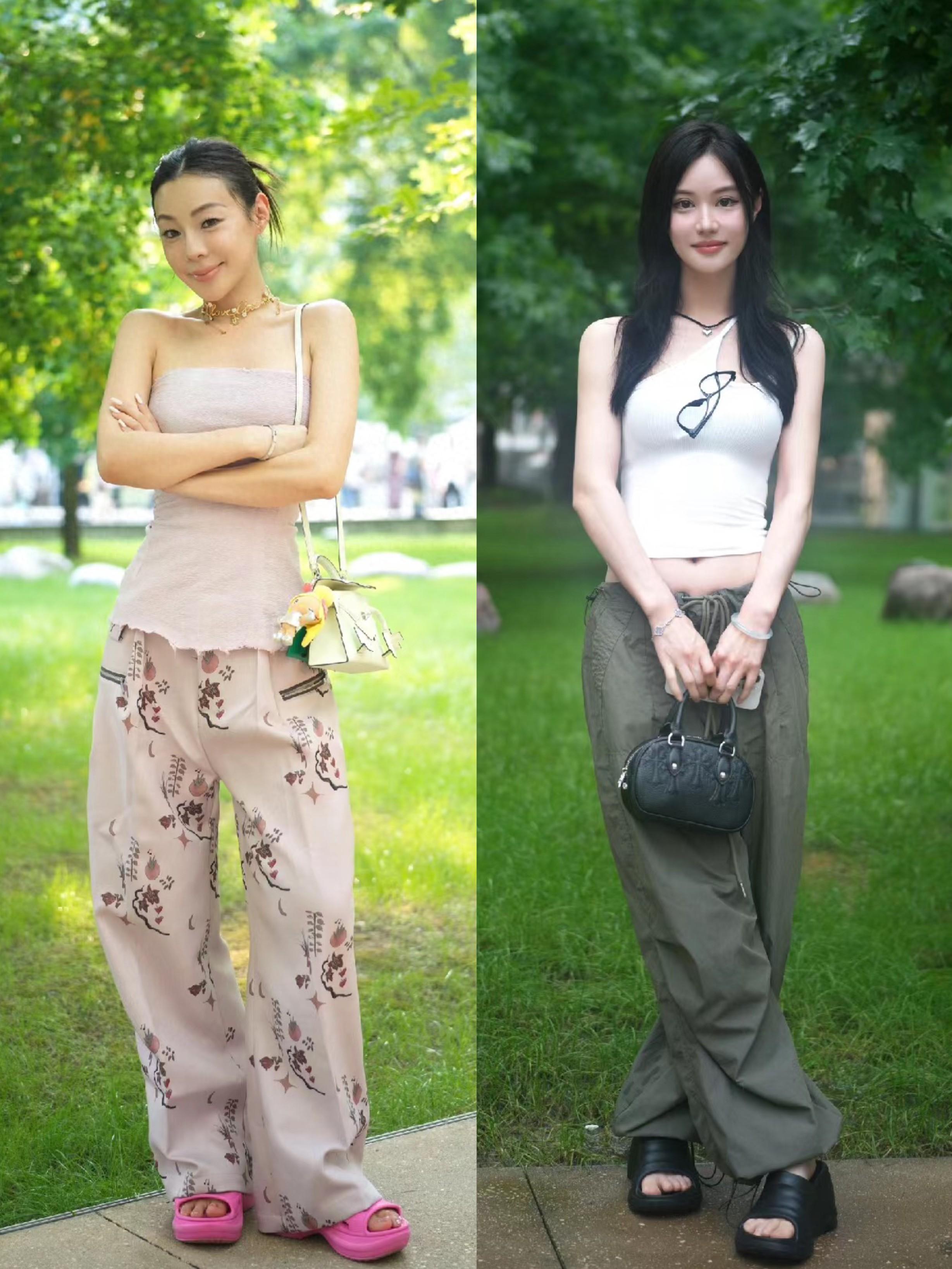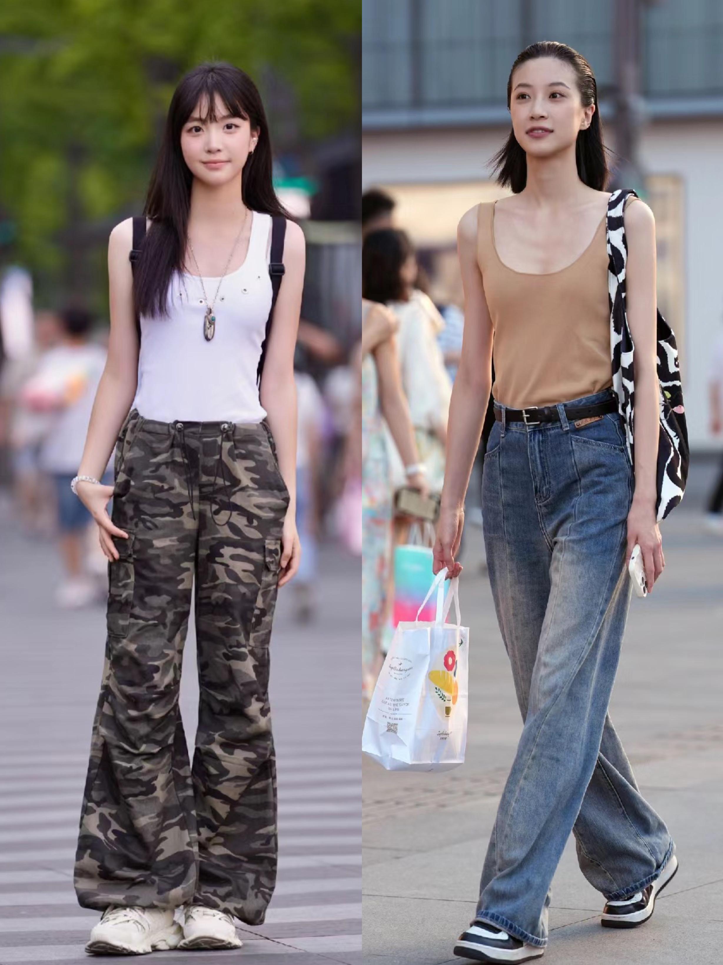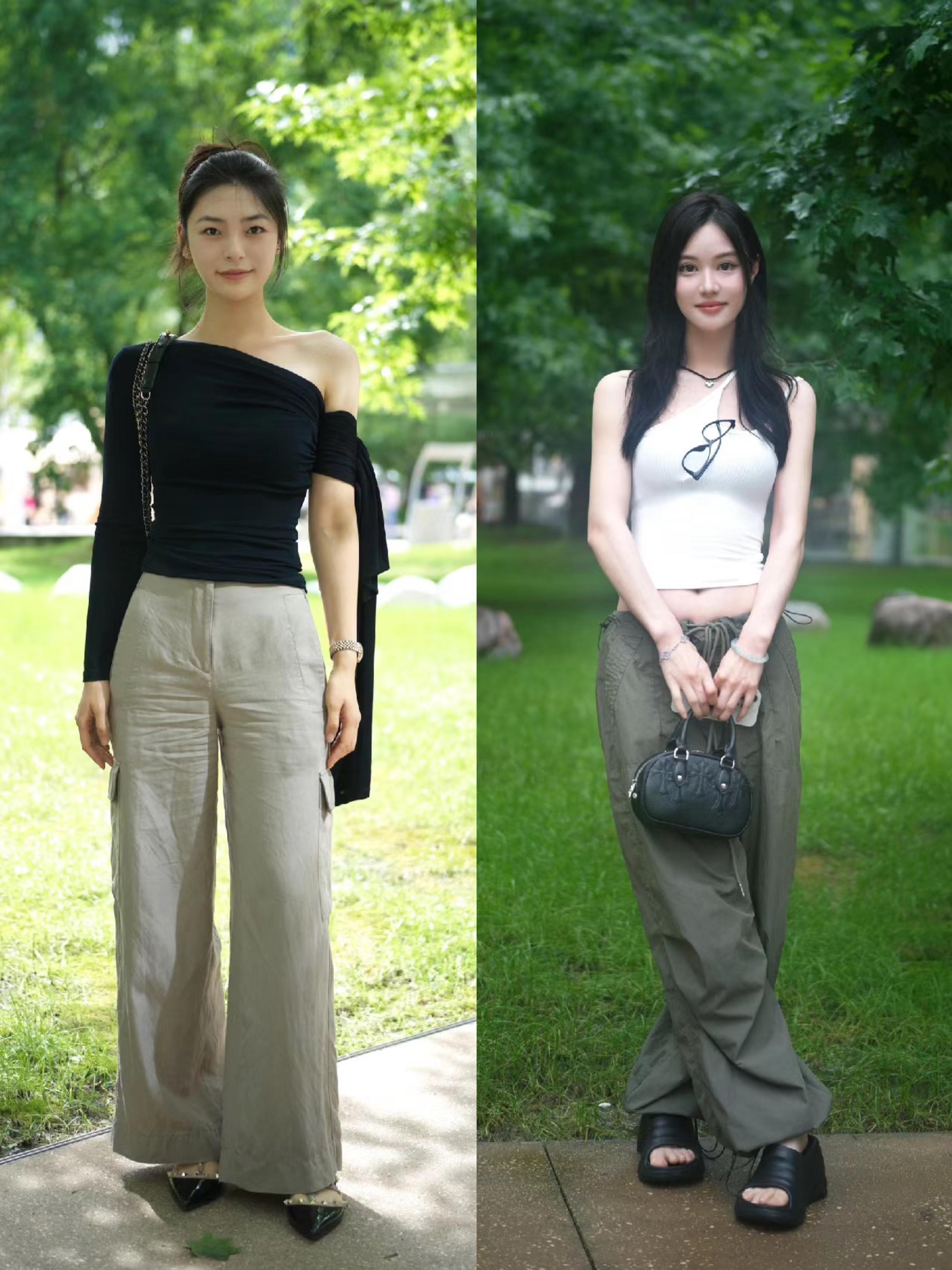 米白色工裝風闊腿褲+厚底的鞋子,酷颯顯腿長。運動風小背心+工裝風拖地褲,上緊下松的組合、真的很颯。
