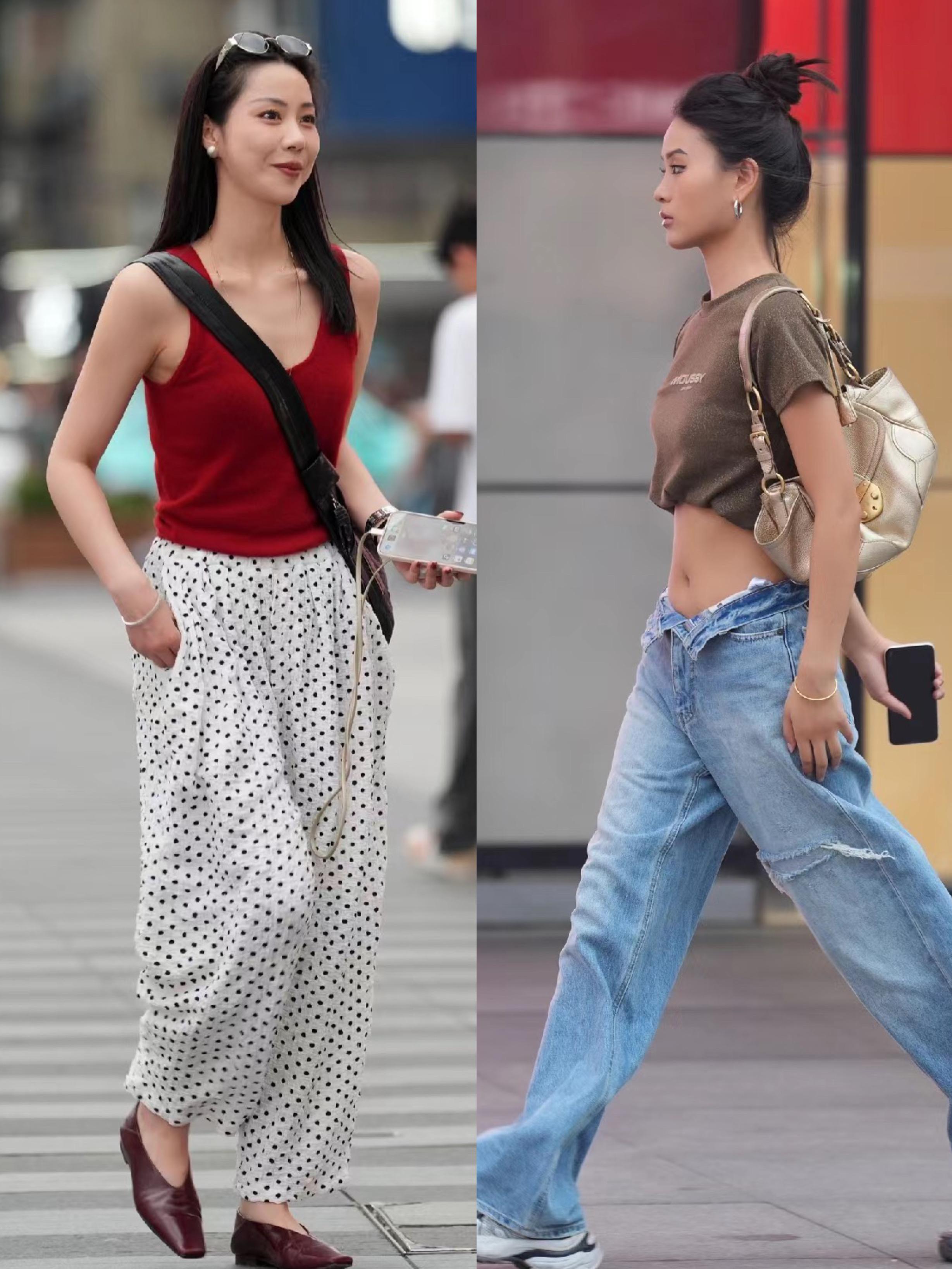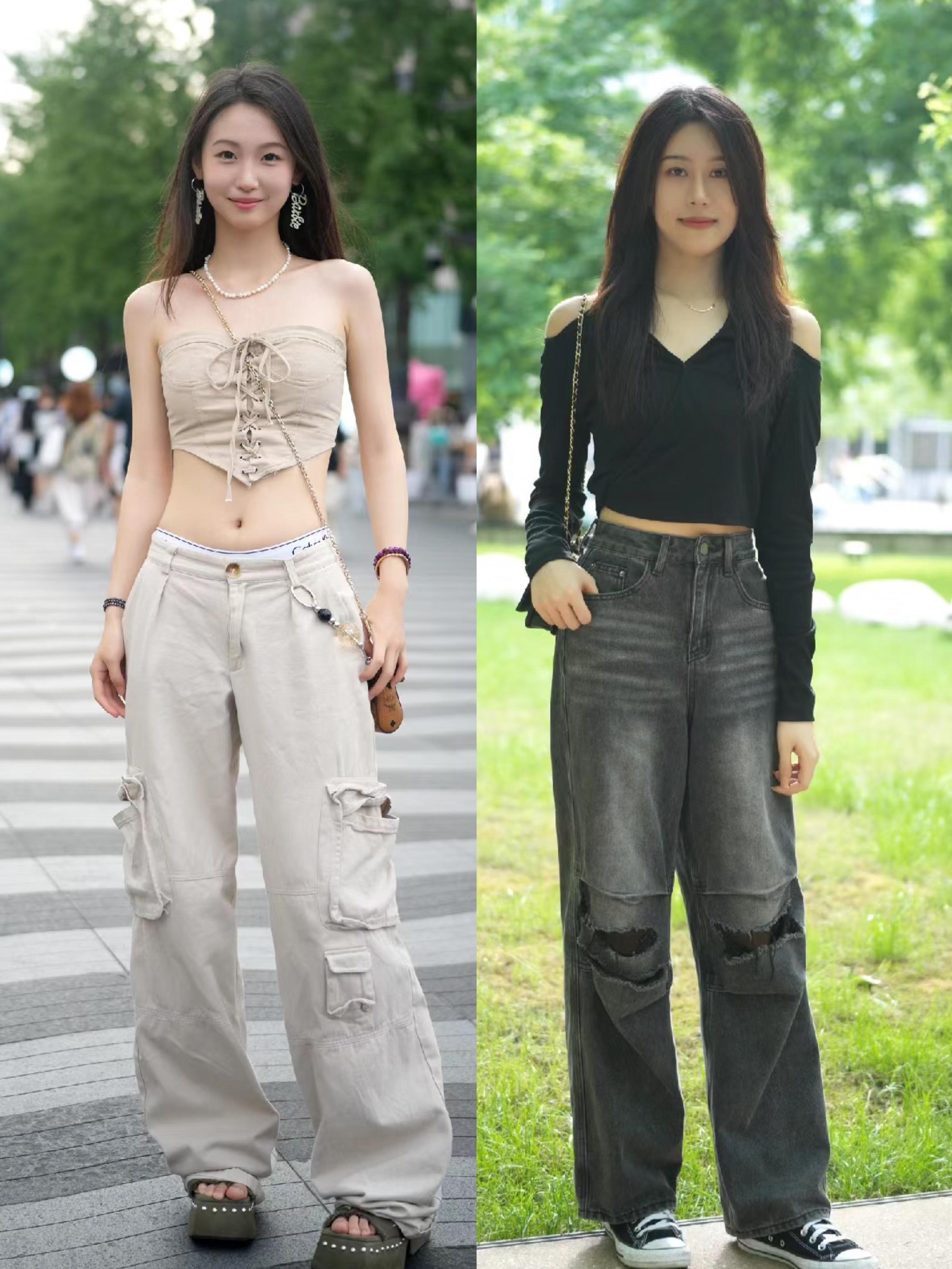 尤其是我們穿着露腰的上衣時,儘量搭配長度拖地的褲子。褲長拖地穿起來更加從容,也讓我們的打扮更加體面,包裹性更強。