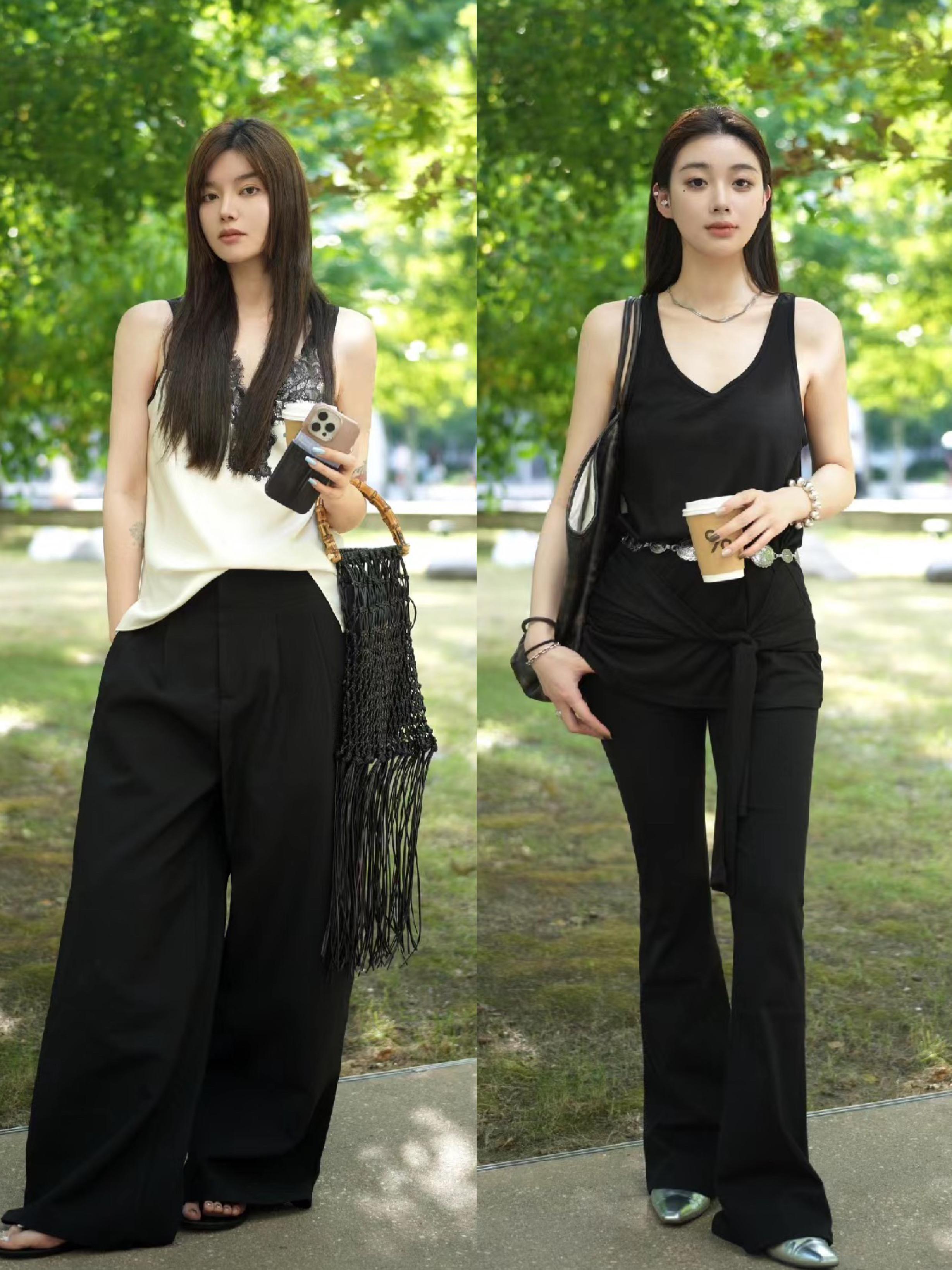用無袖背心來搭配黑色拖地褲,簡簡單單就很舒適。無袖背心可以塞衣角,營造出高腰線。黑色拖地褲可以參考自己的喜好風格,搭配修身款或者寬鬆款。
