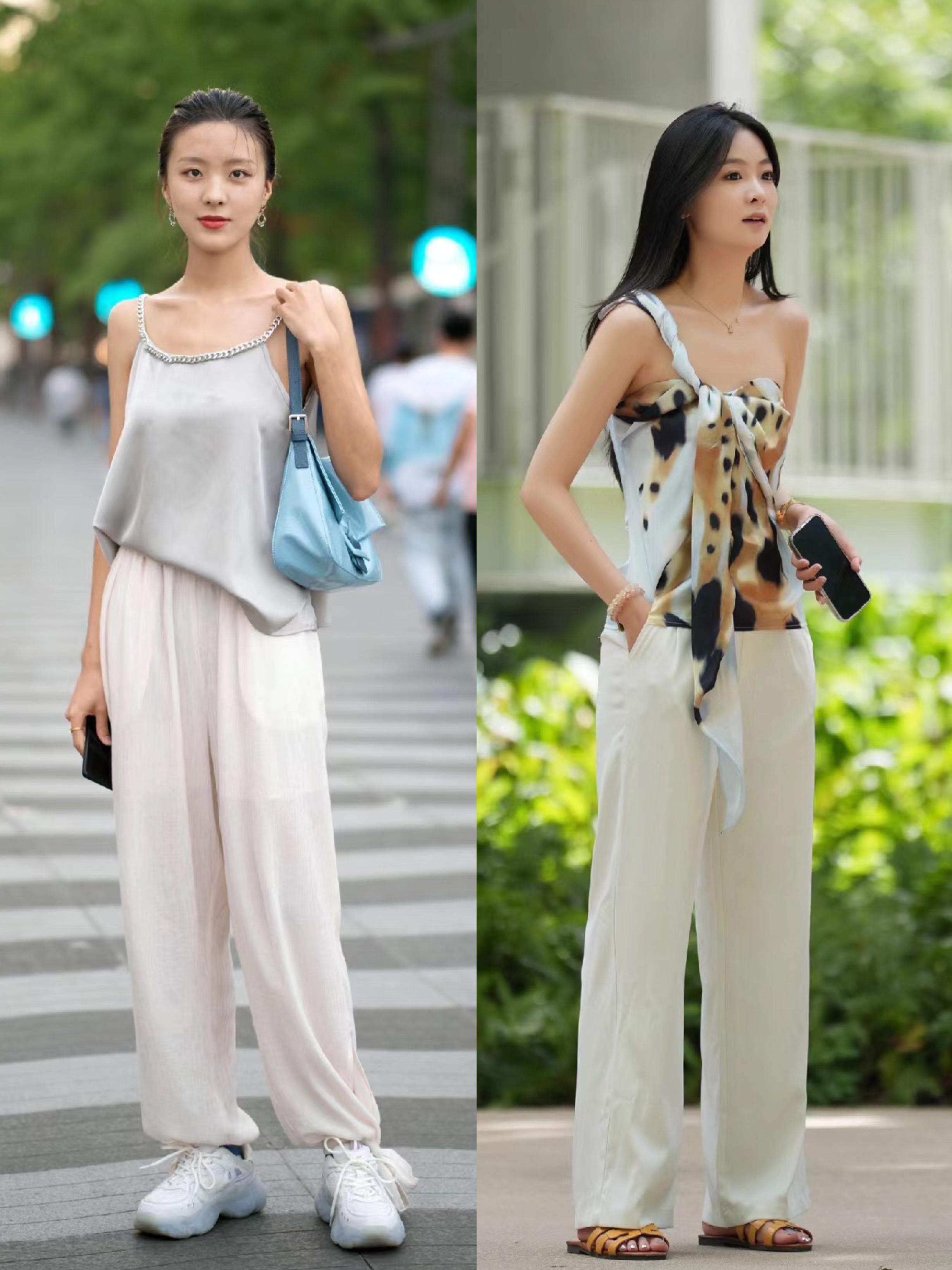 拖地褲的穿搭,自然需要以簡潔爲主。比如白色的直筒拖地褲,就大方時尚。一定的寬鬆度,H型的剪裁,顯得腿型修長、比例感更優越。