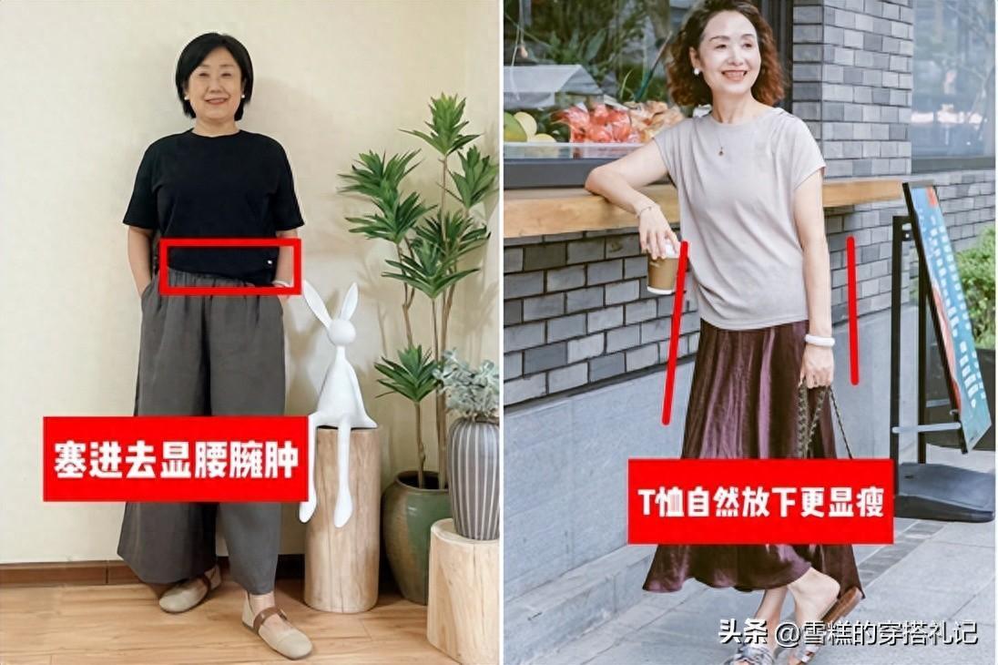 這個夏季不穿T恤就不完整,在這個季節必備的T恤穿搭,你們還在採用塞進褲子裏的穿法嗎?那就一點兒也不時髦了,尤其是對於上了年紀的中年女人來說,T恤塞褲子裏穿,容易暴露小肚腩的粗壯,身材不顯瘦,穿搭也不會好看。