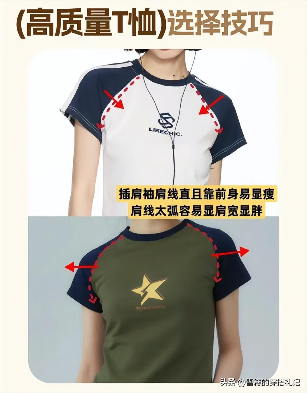 另外T恤袖子到肩部這裏的裁剪設計不同,上身呈現的效果也有很大差異。建議肩袖這裏銜接的線條不要離肩膀距離太近,並且是成直斜線的款式,衣服顯瘦手臂有拉長的效果,特別是對胸部比較豐滿的女人來說,這個地方是顯瘦的關鍵,離肩膀太近會顯得上半身特別粗壯。