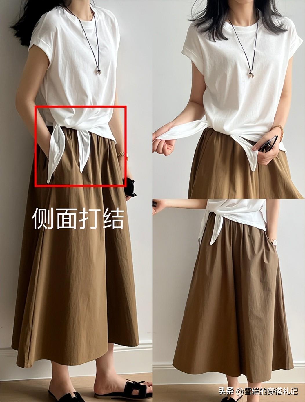T恤這種自然垂下來的穿法不僅要注重線條,也要注重下裝搭配出來的氣質和美觀。穿褲子配T恤,呈現出來的是土氣和難看,特別是穿同樣寬鬆的闊腿褲不把腰身凸顯出來,整個穿搭就會顯得很普。所以下裝選擇裙子來穿會更出圈,裙裝推薦選面料高級的款,比如醋酸半裙身,直接穿出優雅高級。