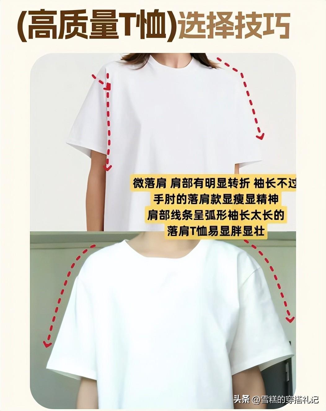T恤別人穿身上能顯瘦,你穿身上卻會有臃腫感,是沒有關注到衣服肩部的設計。能穿在身上達到顯瘦效果的T恤,肩部的設計有夾角設計,大概大於90度小於120度之間,它能將整個肩部支棱起來,顯得人利落又幹淨。而如果是落肩的款式,肩部的設計爲圓弧形,視覺上有膨脹感,不顯胖都難。